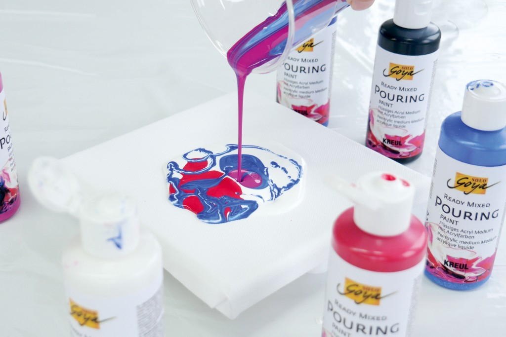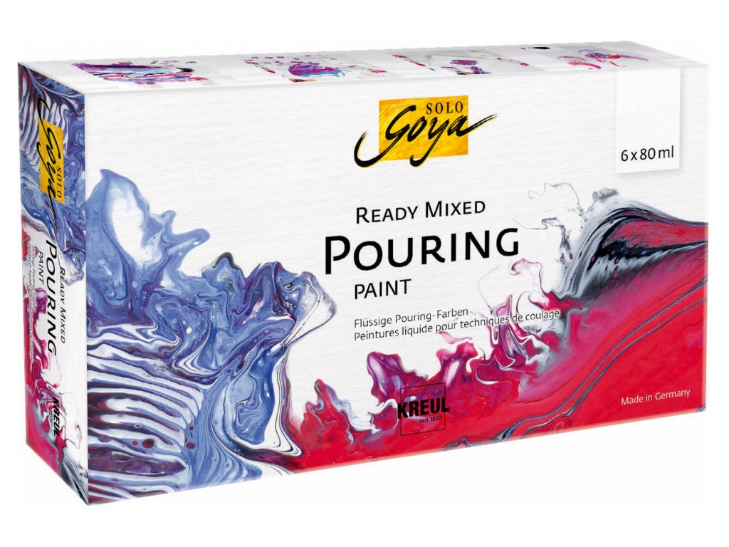 Cu Pouring Solo Goya Ready Mixed, fascinanta tehnică de turnare a vopselei și controlarea curgerii acesteia poate fi încercată imediat! Setul conține culori care au fost deja amestecate și pregătite pentru a fi imediat utilizate. Combinația de tonuri de roșu și albastru este completată de o vopsea cu efect special cu sclipici, precum și de clasicele – Alb și Negru. Ideal pentru toți cei care doresc pur și simplu să înceapă imediat să lucreze.