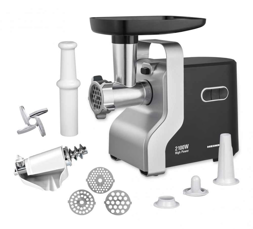 Masina de tocat Heinner MG-2100BKSL, putere maxima: 2100W, capacitate de tocare: 1.8 kg/min, cutit din inox, 2 viteze, 3 site de taiere, accesoriu pentru rosii, accesorii pentru carnati si kibbe, functie Reverse, nivel de zgomot: 90 dB