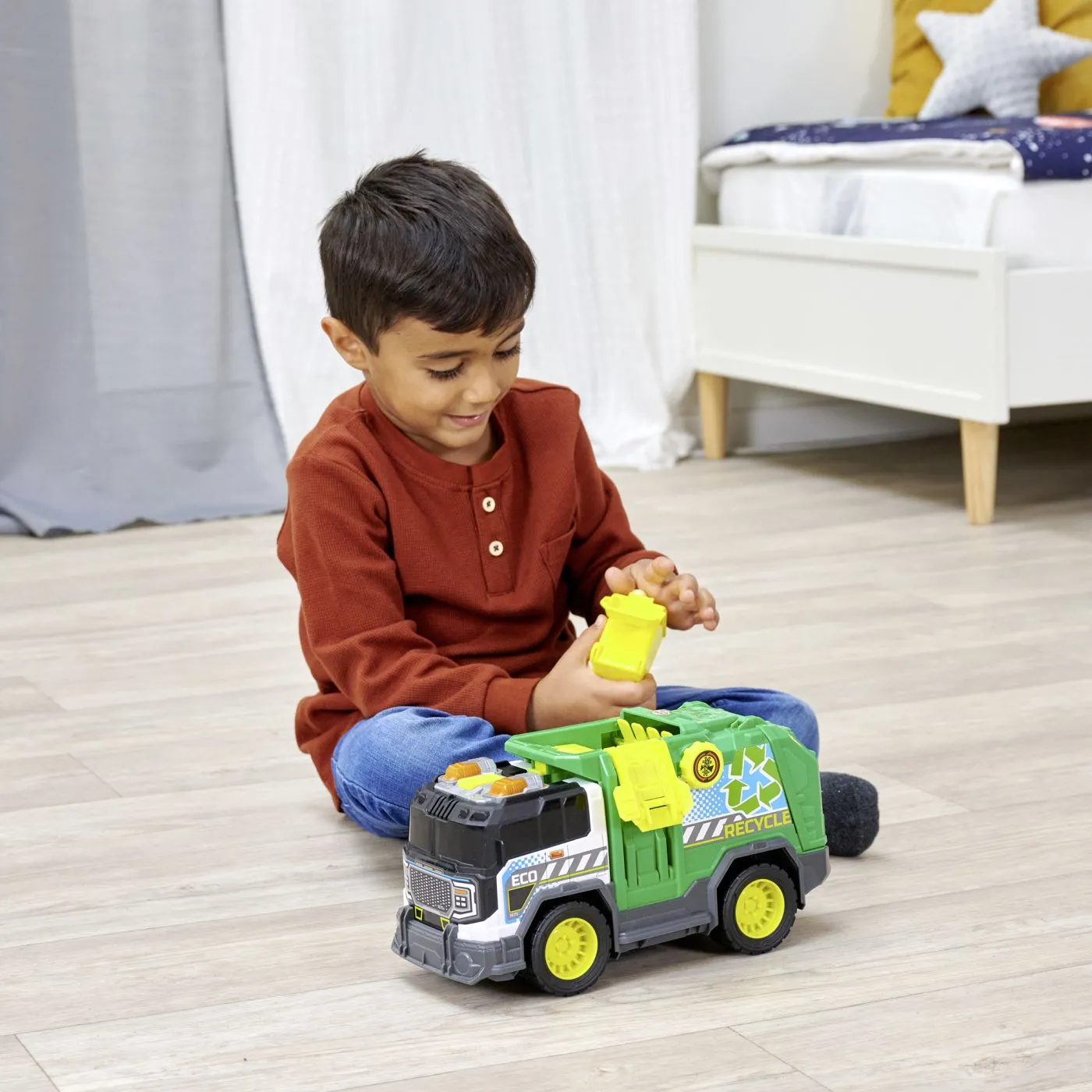 Dickie Toys - Camion de reciclare 30 cm. Camionul de gunoi mare cu functii si accesorii, jucarie pentru colectarea gunoiului pentru copii cu varsta peste 3 ani, cu lumina si sunet, incl. baterii. Copiii cu varsta de 3 ani si peste pot goli jucaus cosul de gunoi si pot transporta obiecte mici prin rotatia de gunoi in interiorul vehiculului. Cand hayonul este deschis, continutul aluneca automat din masina de jucarie de 30 cm - astfel incat camionul de gunoi sa fie rapid gata pentru urmatorul tur! Cu sunetele realiste ale pornirii motorului, bipurilor in marsarier si golirea cosului, precum si o lumina de avertizare pe acoperis, jocul cu camionul devine si mai incitanta (baterii incluse).