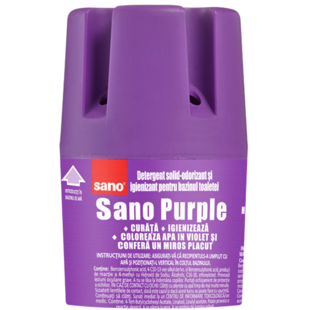 Detergentul solid Sano Purple este un odorizant si igienizant pentru bazinul toaletei. Acest produs curata si dezinfecteaza cu eficacitate sporita atunci cand este asezat corespunzator in bazinul de apa al toaletei.
