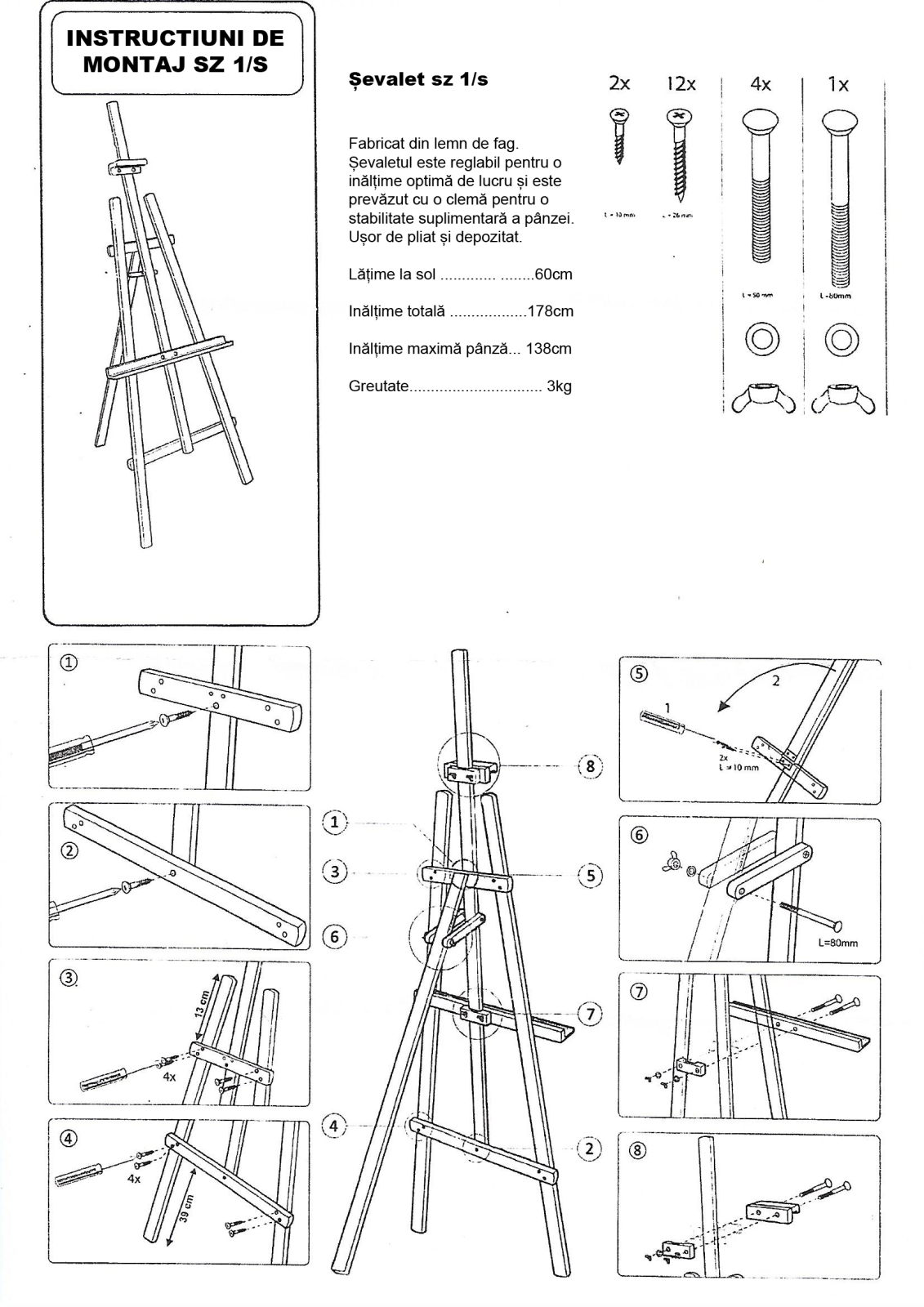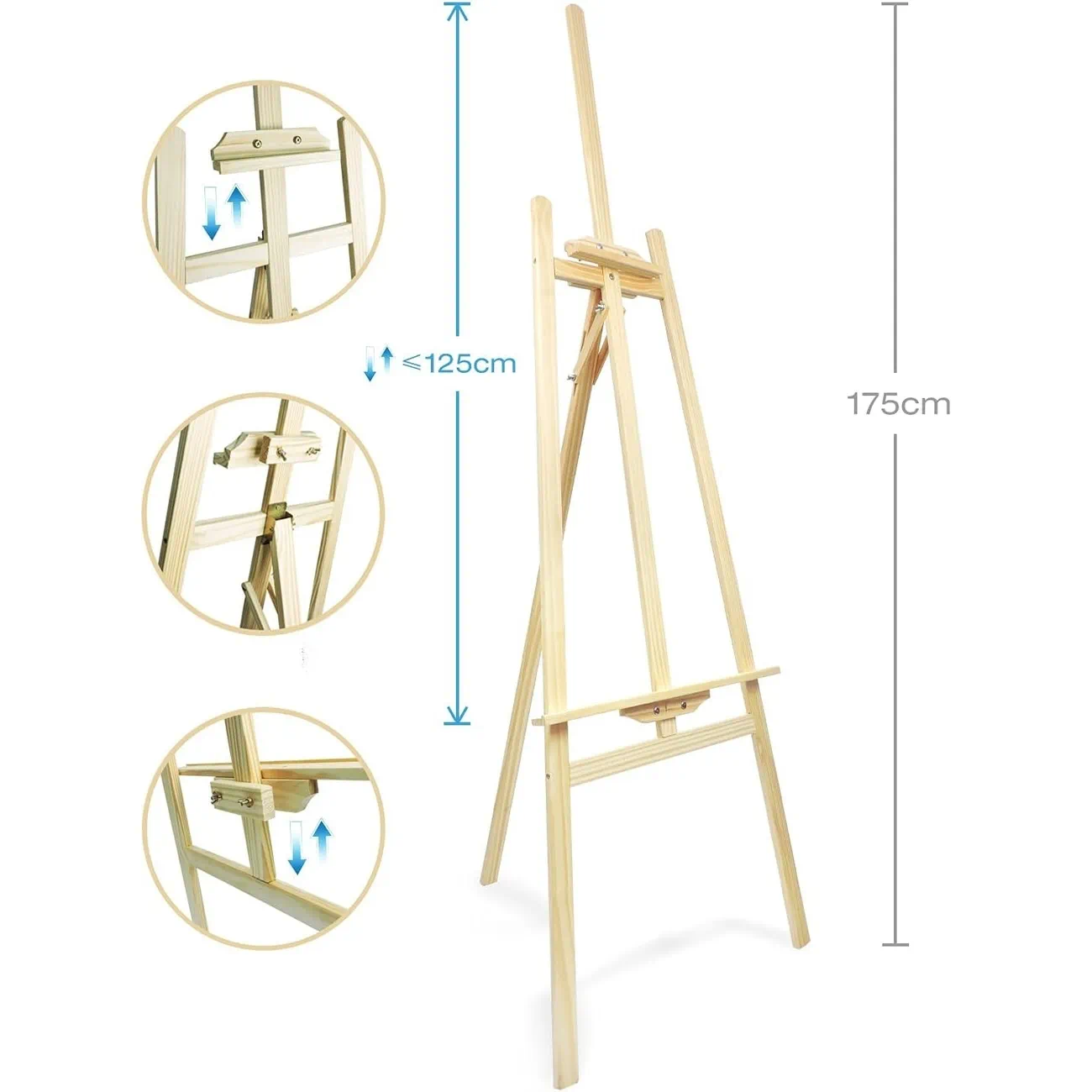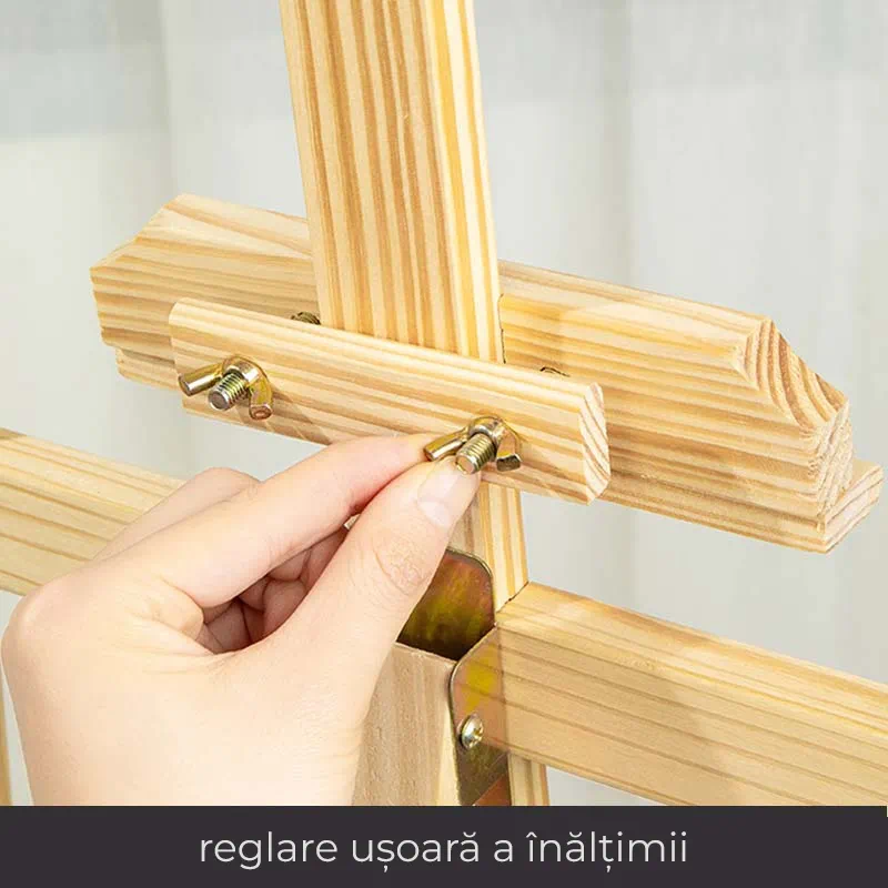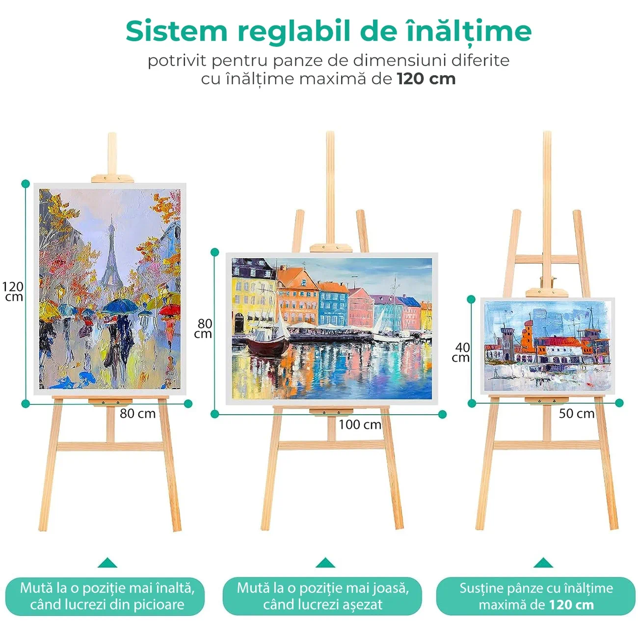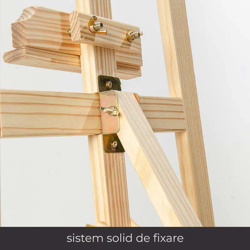Sevaletul trepied din fag este proiectat pentru pictori începatori, avansati sau profesionisti care au nevoie de o solutie robusta si usor de reglat. Lemnul de fag oferă rigiditate si durabilitate superioara, iar geometria tip trepied pastreaza panza stabila chiar si la miscari energice de pensula. Inaltimea si inclinatia se ajusteaza rapid, astfel incat sa poti lucra confortabil, fie ca stai pe scaun sau in picioare. Cu o inaltime maxima de 170 cm si o baza de 60x55 cm, sevaletul sustine panze de pana la 125 cm inaltime, ideale pentru lucrari medii si mari. Pachetul vine cu instructiuni clare si toate elementele de prindere necesare, astfel incat montajul sa fie intuitiv si rapid.