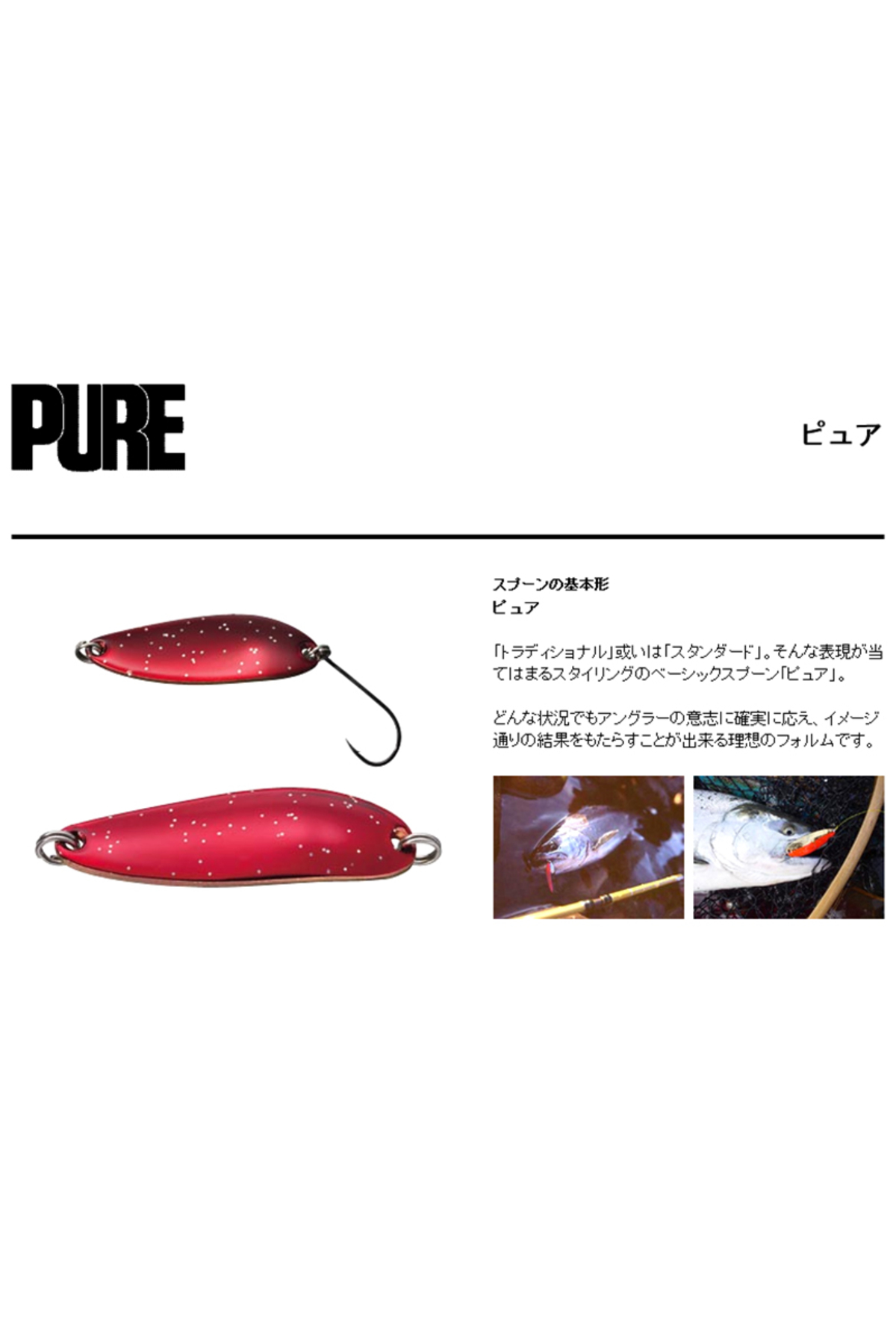 "Traditionala" sau "Standard" - acestea sunt cuvintele care descriu cel mai bine stilul linguritei de baza "Pure". Forma sa ideala raspunde cu incredere intentiilor pescarului in orice situatie oferind rezultate exact asa cum au fost imaginate. Rectioneaza constant la o varietate larga de tehnici complexe fiind adaptabila oricaror conditii - de la recuperari lente in lacuri sau ape cu curgere lina pana la prezentari tip drift-si-intoarcere care se folosesc cu pricepere curentul din apele de munte. O lingurita de nelipsit din trusa indiferent de locul de pescuit. SPECIFICATII: *Lungime: 5cm *Greutate: 9.5g *Nu se livreaza cu ancora sau carlig.