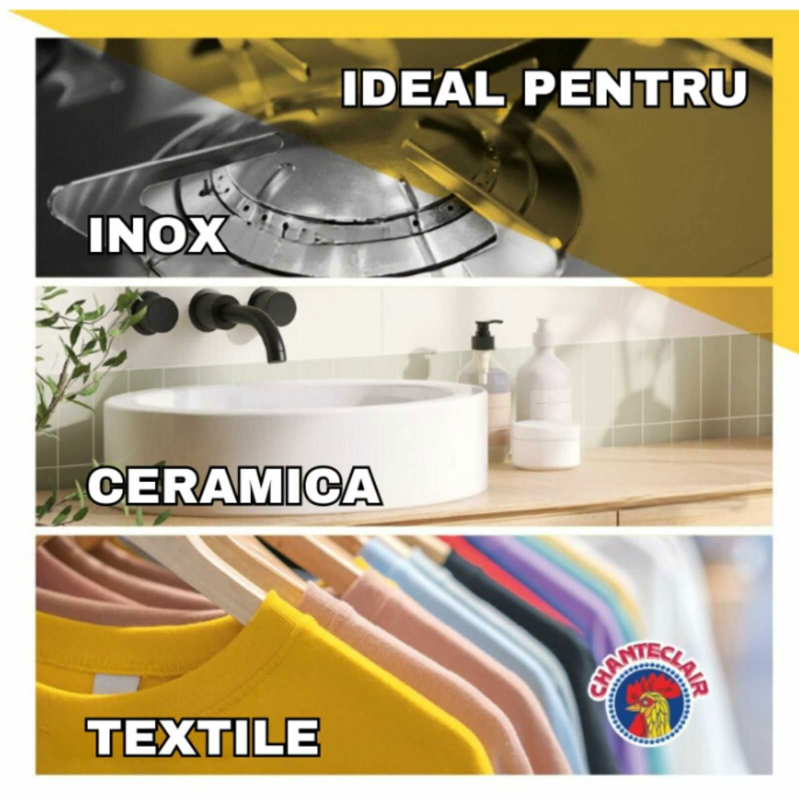 Pe langa suprafetele clasice precum inox, ceramica, gresie si electrocasnice, acest produs poate fi folosit si pe haine sau alte produse textile pentru a elimina eficient petele dificile. Este ideal pentru curatarea grasimilor si murdariei de pe imbracaminte.