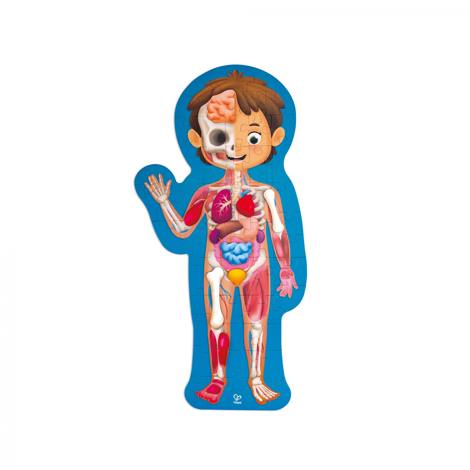 Puzzle pentru copii - Corpul Uman (61 piese).. Cei mici sunt fascinati de corpul uman - urmariti-va copilul cum invata totul despre el singur cu acest puzzle de anatomie frumos ilustrat pentru copii. Aceasta jucarie educativa ajuta copilul sa invete prin joaca. Isi lucreaza abilitatile de rezolvare a problemelor in timp ce aranjeaza piesele de puzzle, apoi pozitioneaza oasele, organele si muschii din lemn deasupra puzzle-ului.