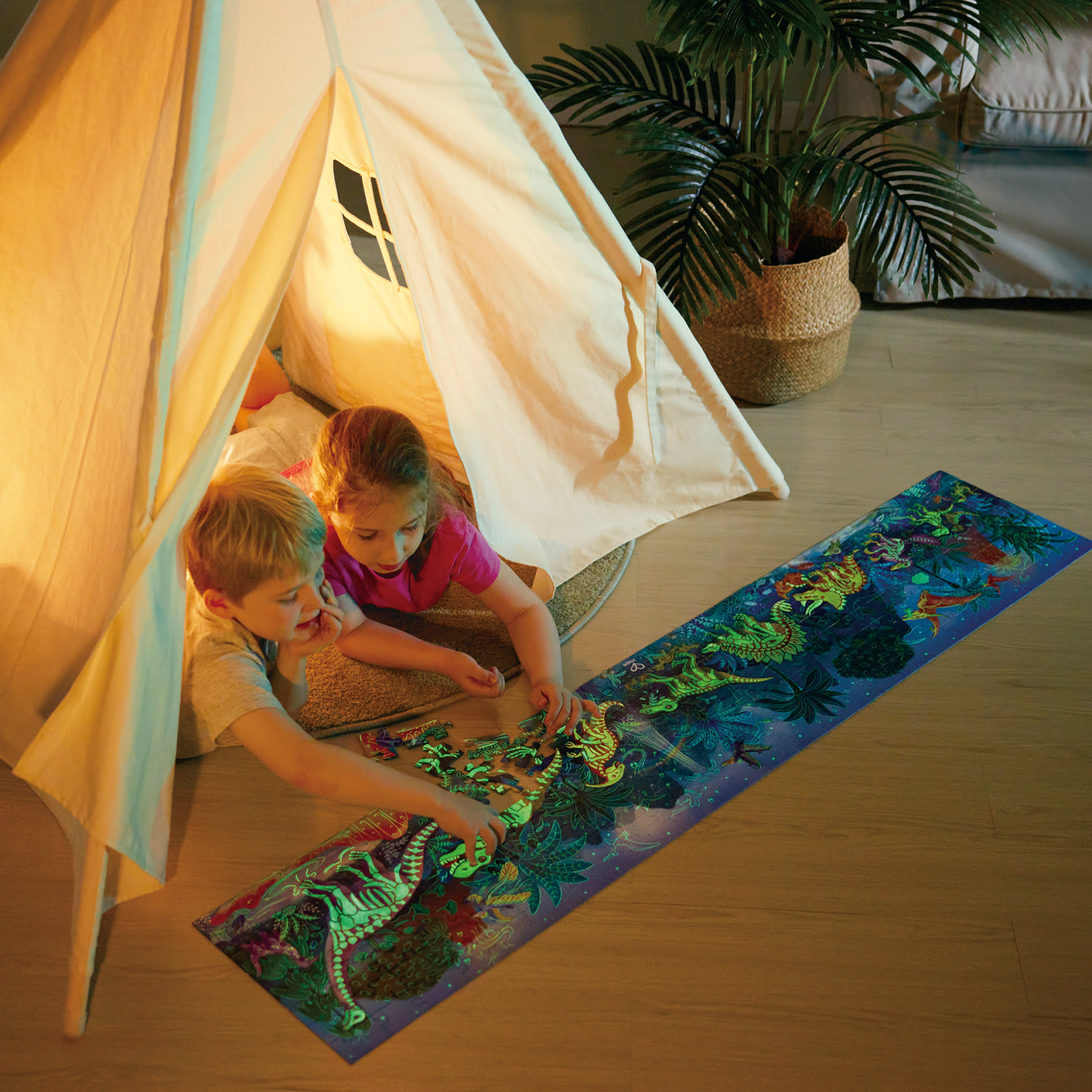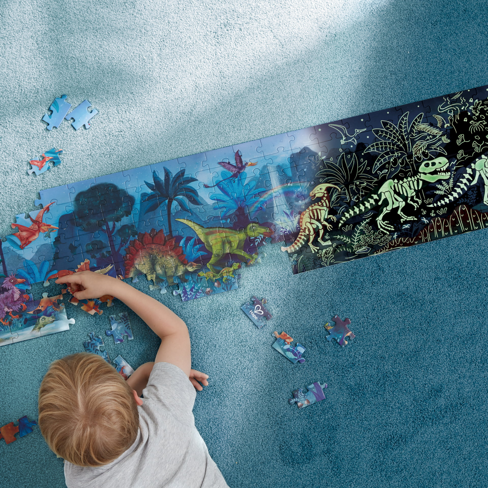 Puzzle pentru copii flourescent cu Dinozauri (200 piese).. Da viata fiarelor preistorice preferate ale copilului tau cu acest puzzle cu dinozauri colorat si care straluceste in intuneric! Intinzandu-se pe o lungime de aproape 1,5 metri, copiilor le va placea sa puna impreuna cele 200 de piese ale puzzle-ului din nou si din nou. Copiii iubesc culorile vii si scena junglei, plus scheletele de dino care stralucesc in intuneric, dezvaluite cand stingi intrerupatorul luminii.