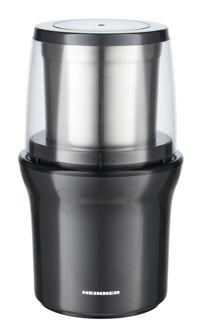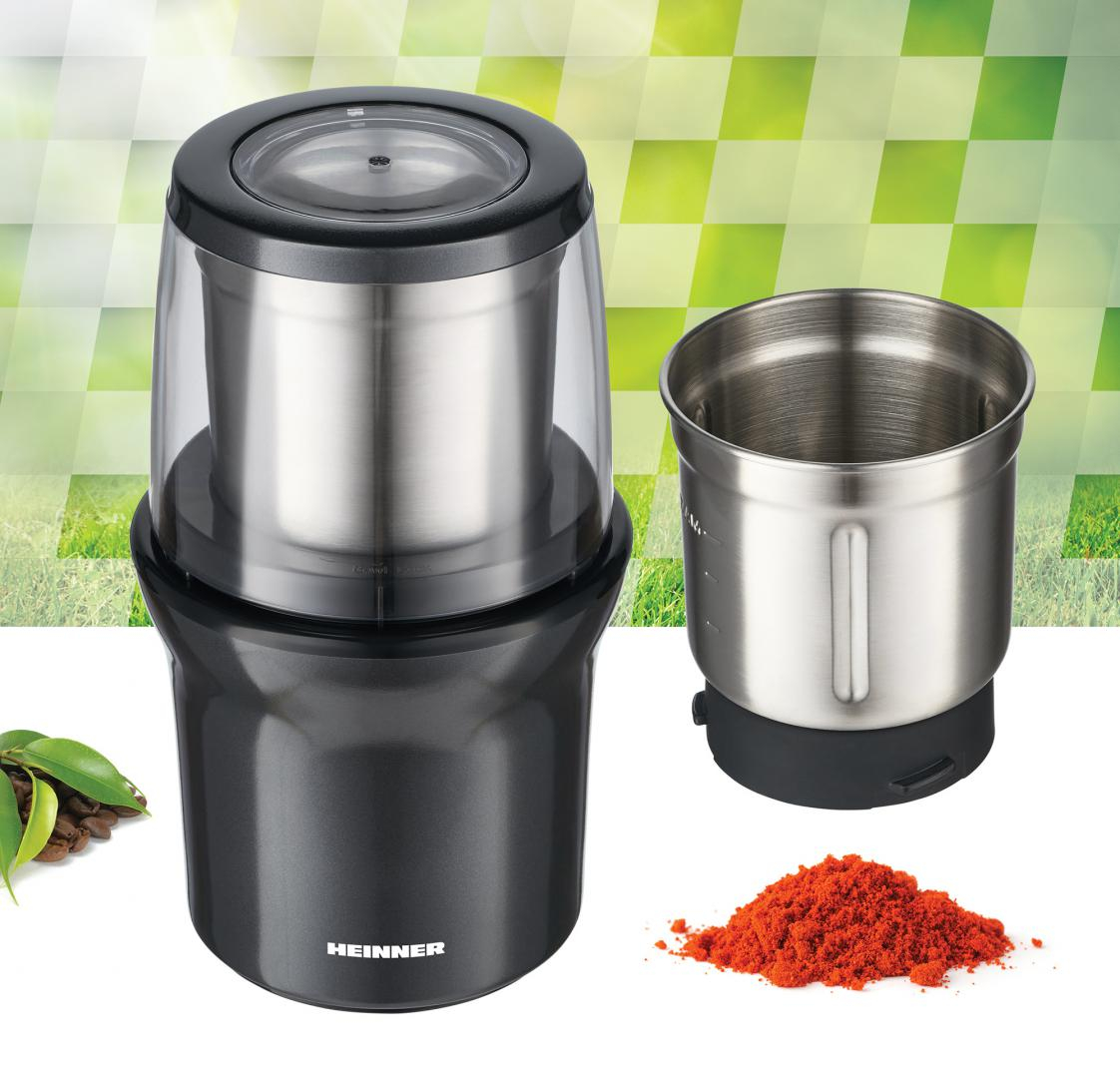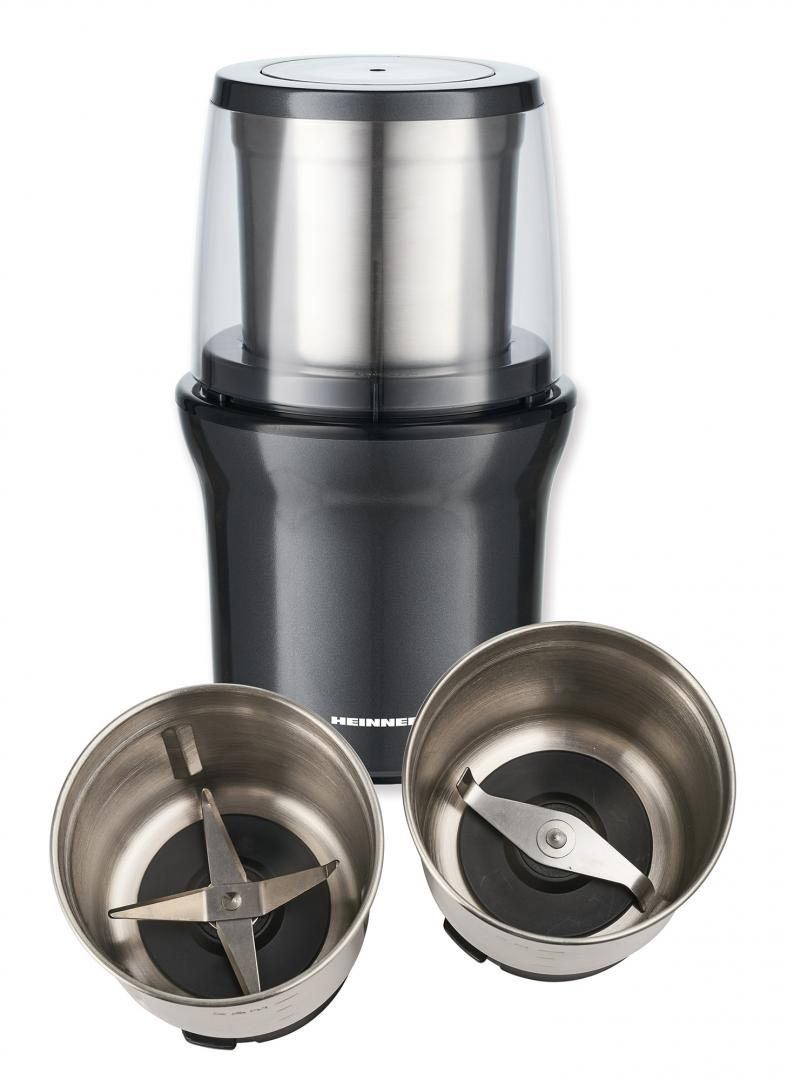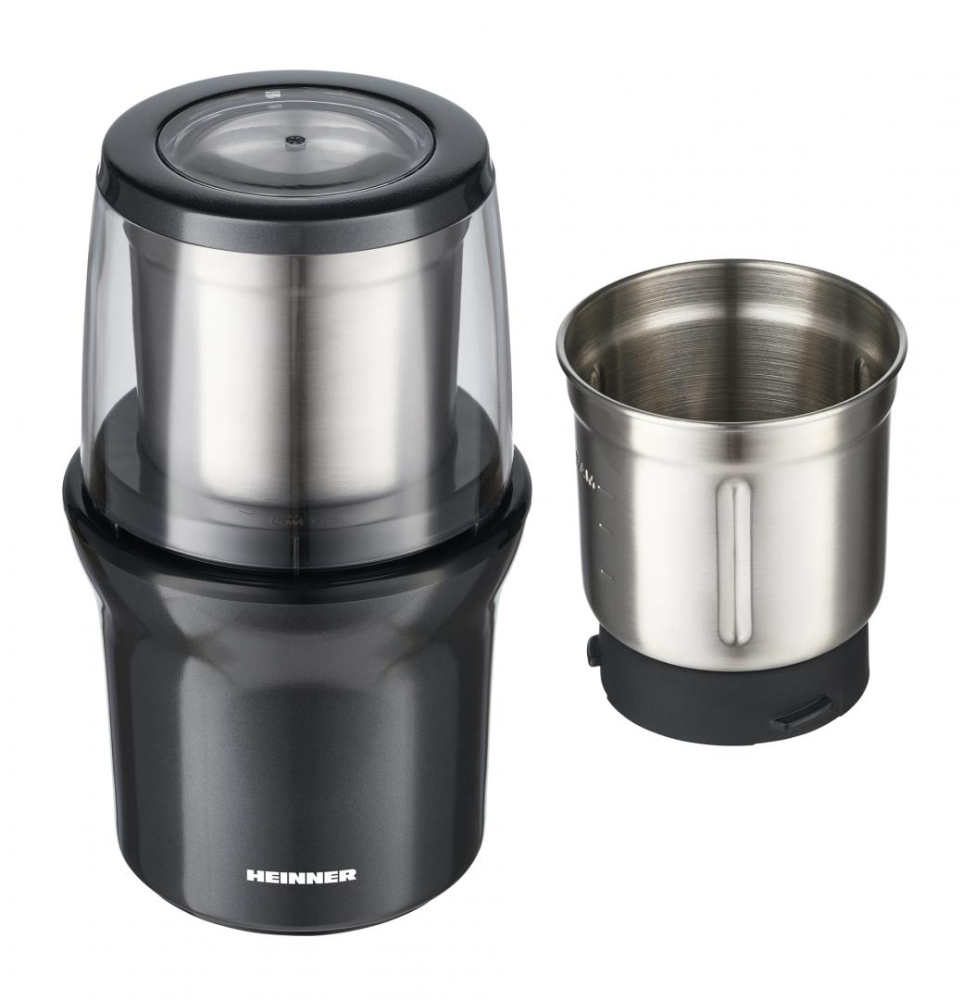 Rasnita electrica HEINNER HCG-200DG2, 2 recipiente din inox detasabile, rasnire uscata si umeda, lame din inox, capacitate 70g, operare prin apasare capacului, carcasa din inox, putere 200W, gri sidef inchis