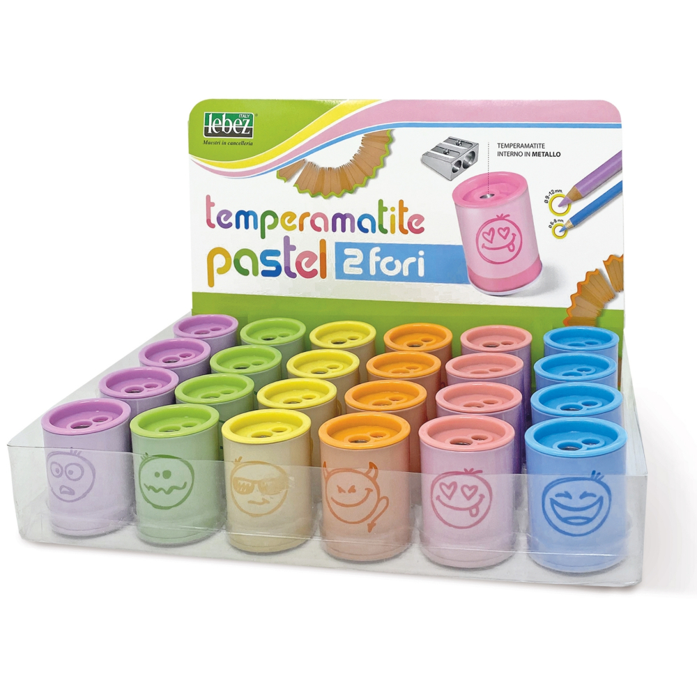 Ascutitoare de creion cu 2 gauri si container Pastel, 6 modele (24 buc/display), copii varsta 3 ani+,6 ani+,8 ani+