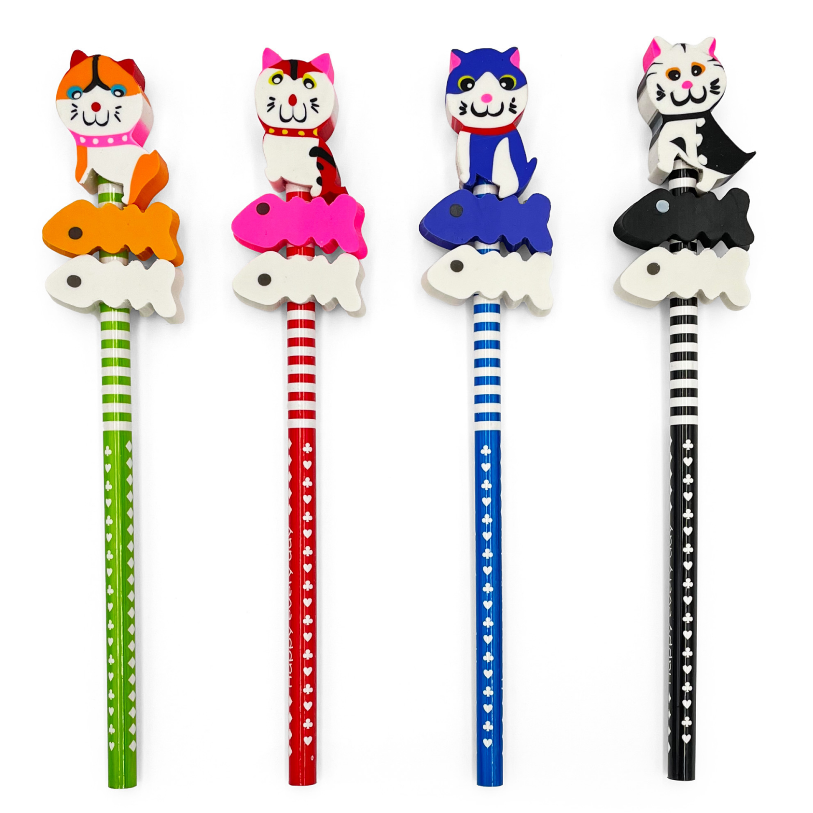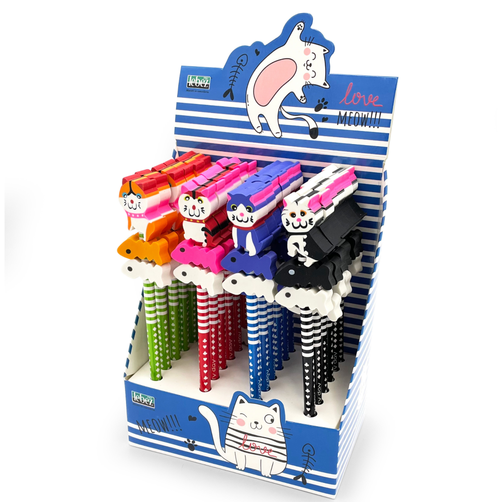 Creion grafic Pisica cu 3 radiere, 4 modele (24 buc/display), copii varsta 4 ani+,6 ani+,8 ani+