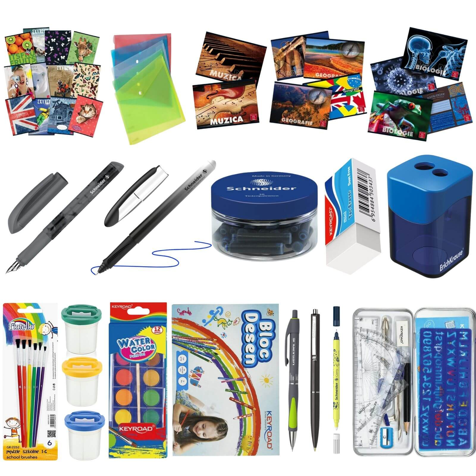 Produsele incluse acopera toate activitatile scolare esentiale – scriere, matematica, muzica, desen, pictura, biologie, geografie – astfel incat elevii sa fie pregatiti pentru orice provocare.