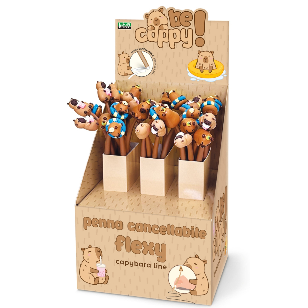 Pix flexibil din colectia BeCappy Capibara, prevazut cu cerneala albastra stergatoare si radiera integrata in capac. Corpul este realizat din silicon moale, oferind confort la utilizare. Design modern, disponibil in 3 culori si 6 modele asortate. Fiecare pix este ambalat individual._x000D_ Produsul este prezentat in display de 24 bucati, cu dimensiuni: latime 16 cm × inaltime 33 cm × adancime 16 cm._x000D_ _x000D_ ATENTIE! Pretul afisat este pentru o bucata, numarul de bucati/display este informativ.