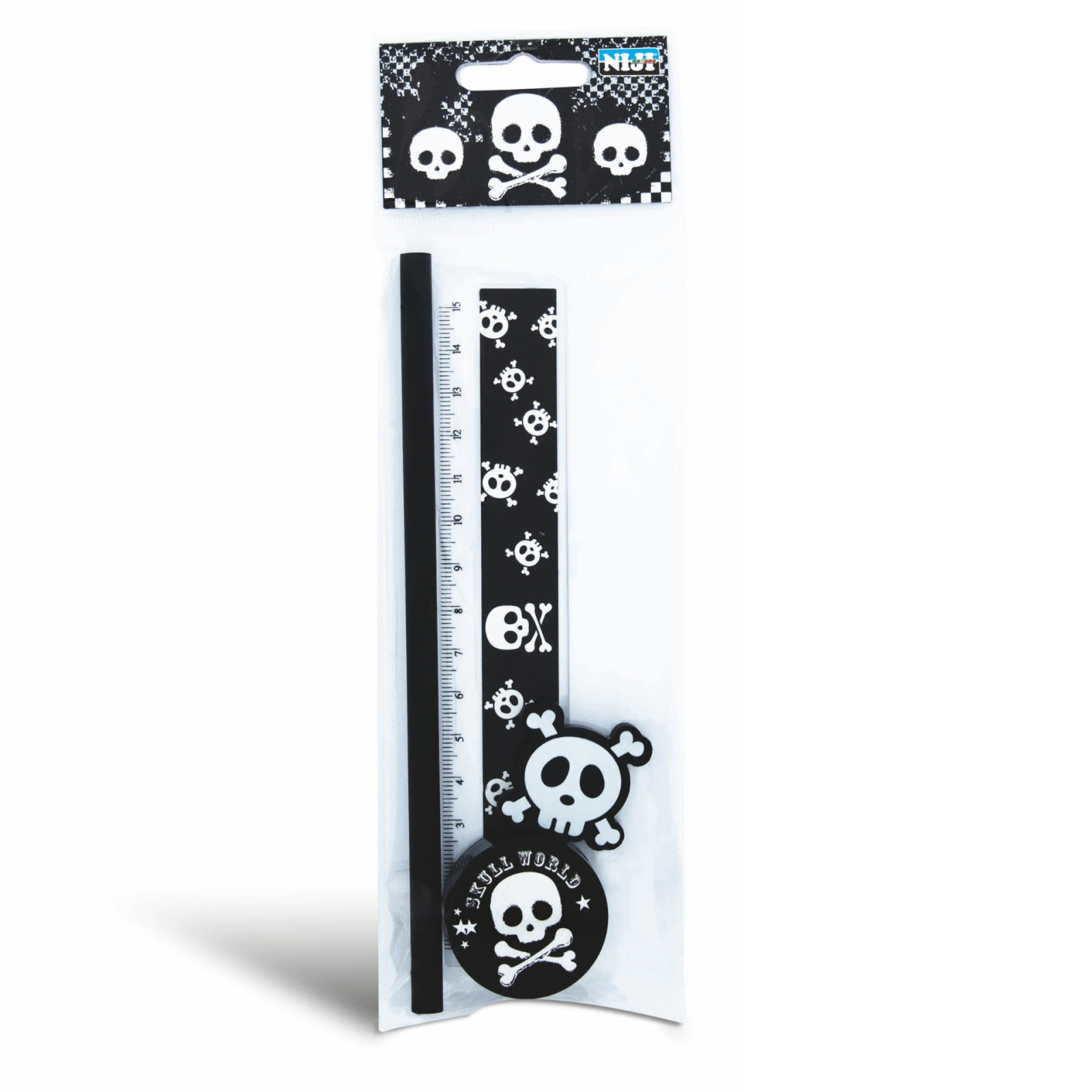 Set scolar cu craniu (1 radiera, 1 ascutitoare, 1 rigla de 15 cm, 1 creion), copii varsta 3 ani+,6 ani+,8 ani+