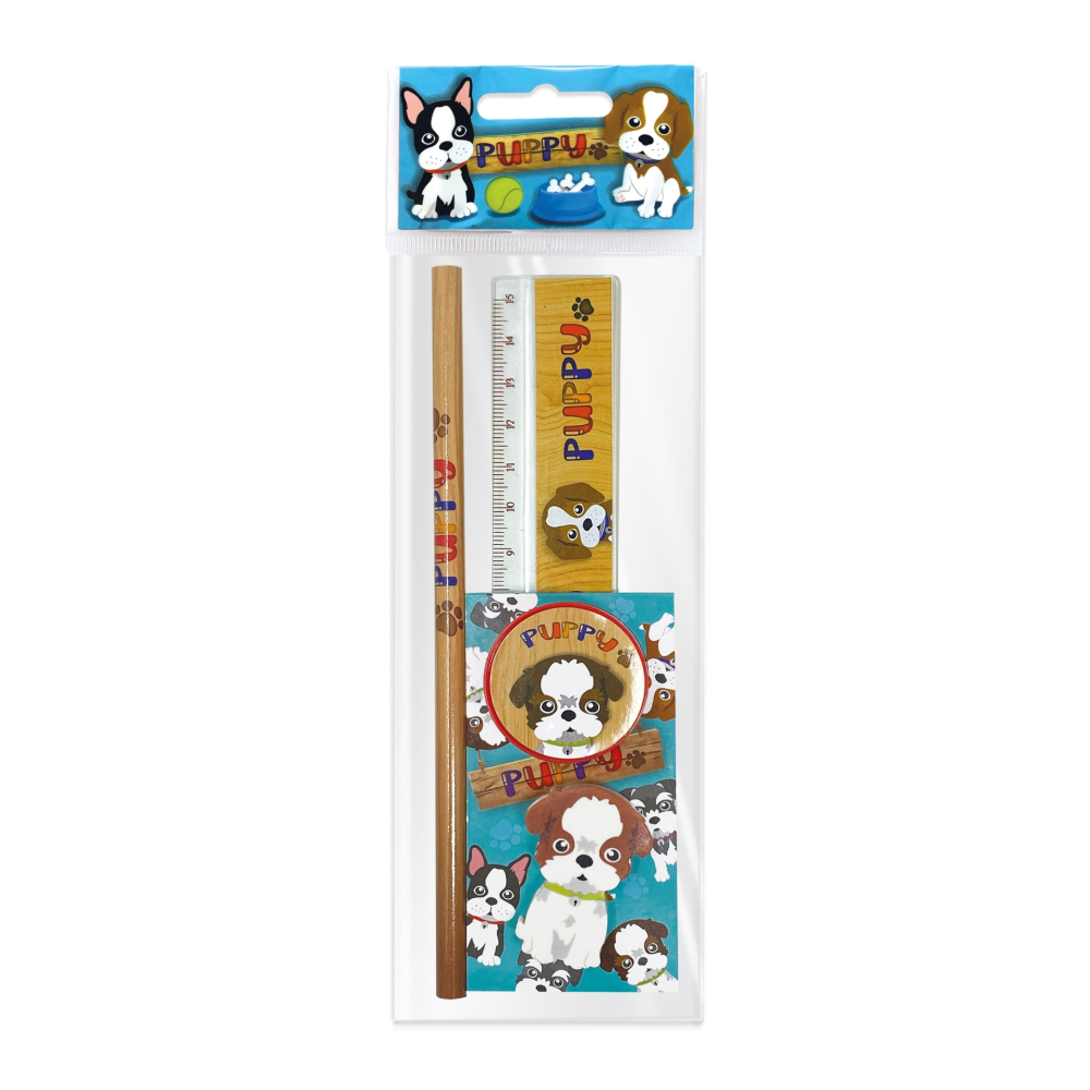 Set scolar Puppy (1 radiera, 1 ascutitoare, 1 rigla de 15 cm, 1 creion, 1 mini blocnotes), copii varsta 3 ani+,6 ani+,8 ani+