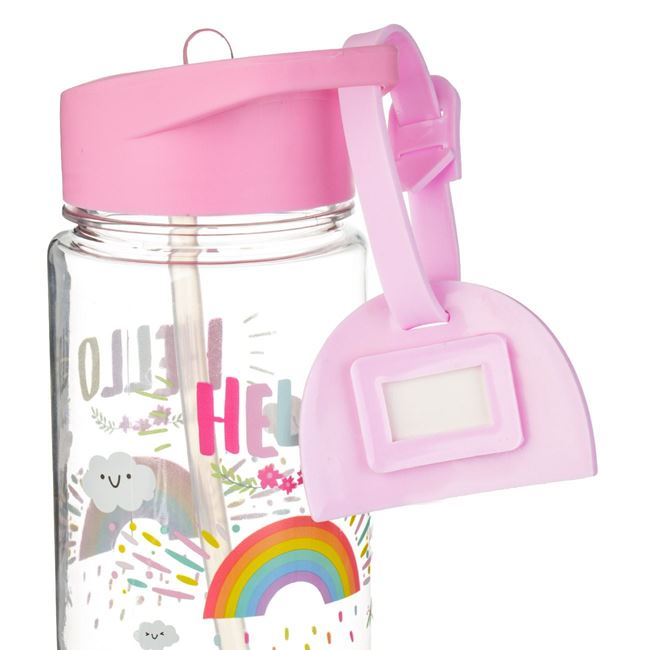 Bidonas apa pentru copii, cu Pai si Maner pentru transport, sticla de apa reutilizabila cu sistem de baut Pop Up, capac roz, model rainbow, cu maner inelar pentru transport usor si o eticheta pentru a scrie numele copilului, capacitate 440 ml, dimensiuni 7 x 16.5 cm, BPA Free.
