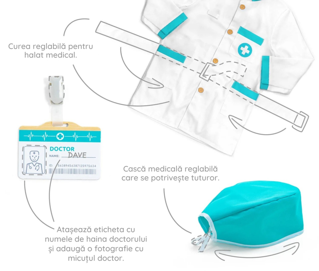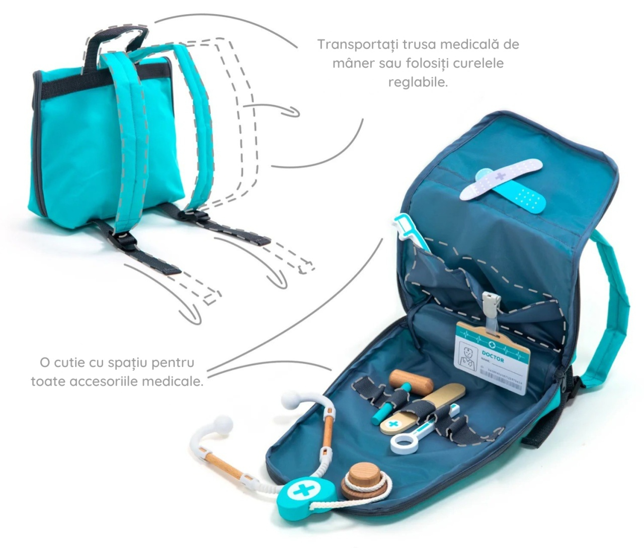 Joc de rol Trusa completa de doctor, turcoaz, UMU Toys Un joc de rol educativ pentru micii medici in devenirecu un design modern si culori atractive! Trusa include tot ce are nevoie un doctor mic cu inima mare pentru a ingriji pacientii imaginari: stetoscop, termometru, ecuson personalizat, model dentar si multe altele. Copiii pot invata despre corpul uman, grija fata de ceilalti si importanta sanatatii, prin joaca activa si plina de sens. Halatul alb cu detalii turcoaz, boneta si rucsacul medical transforma fiecare copil intr-un adevarat doctor. Joaca devine interactiva, iar imaginatia lor capata sens si directie. Rucsacul functioneaza si ca geanta de transport, cu compartimente pentru fiecare instrument. Piesele sunt fabricate din lemn si textil, cu margini rotunjite, fiind sigure si rezistente. Totul este gandit pentru siguranta, confort si distractie maxima. 🎠Cadoul potrivit pentru micii exploratori curiosi, cu ocazia Craciunului, Pastelui sau Zilei Copilului. Setul contine 20 de piese: halat de doctor (cu cordon reglabil), boneta, ecuson, stetoscop, tensiometru, seringa, termometru, plasturi, penseta, periuta de dinti, model dentar, ciocanel reflexe, lupa, spatula, pastile, card de identificare, rucsac cu bretele ajustabile. Varsta recomandata: 3“6 ani (marime halat 98“116 cm) 🌱 Realizat din lemn, textil si plastic prietenos cu mediul, vopsele pe baza de apa. Conform EN71 & ASTM, certificat CE AVERTISMENT: Contraindicat copiilor sub 3 ani. Necesita supravegherea unui adult in timpul jocului. Produs in China pentru UMU Toys, Cehia.