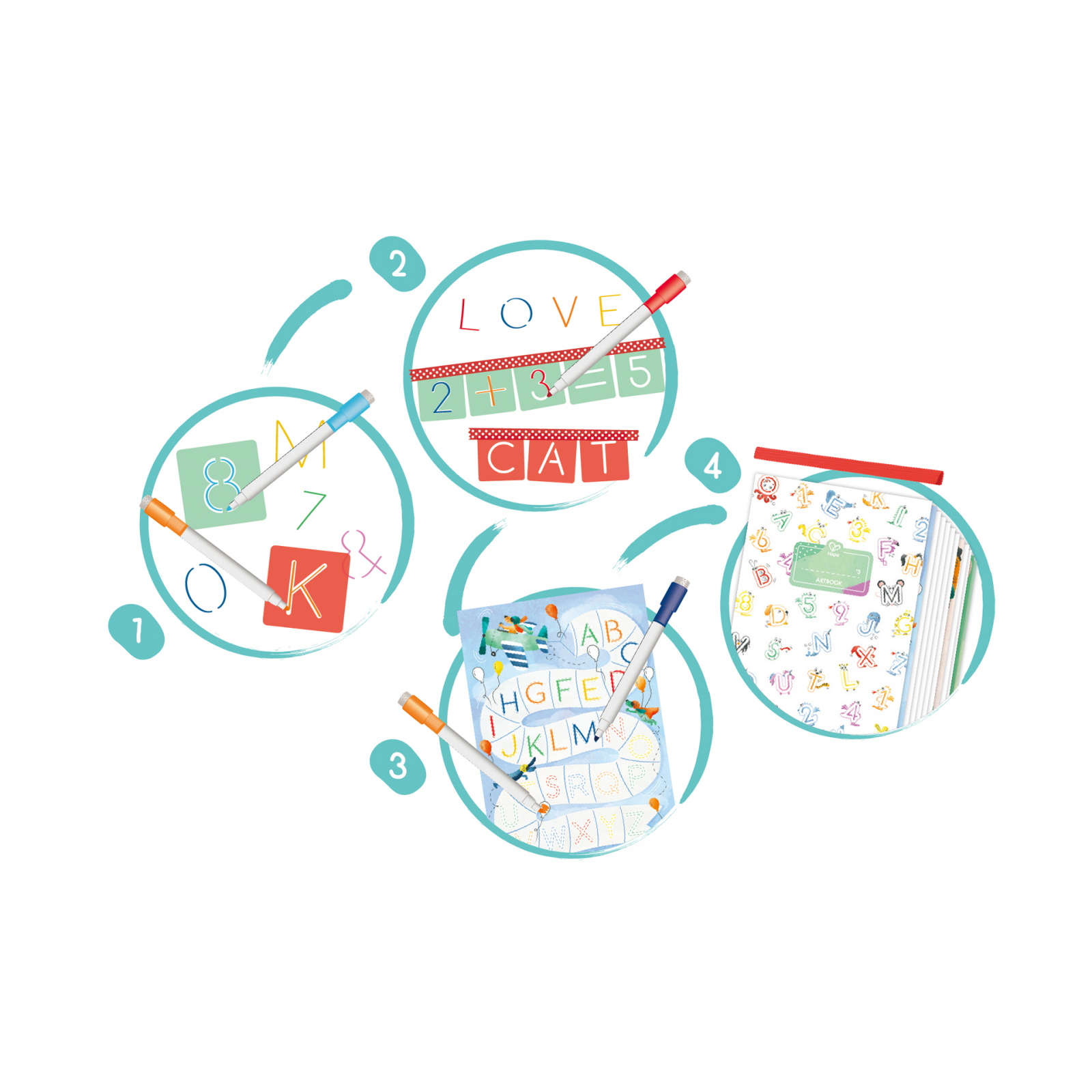 Kit de invatare copii cu litere si numere - 66 piese.. Micutul tau va invata despre alfabet, numarat si scriere in cel mai scurt timp cu acest set de trasare a literelor si numerelor cu design colorat pentru prescolari. Este educativ – dar copiii se distreaza atat de mult, incat cred ca pur si simplu se joaca! Perfect pentru mintile mici sa invete alfabetul, numararea si exersarea scrisului. Include 44 de litere, numere si sabloane de semne, opt markere marcatoare pentru tabla alba cu radiere, un album de activitati si o clema de legare. Folosind sabloane cu litere, copiii pot realiza litere si numere perfect formate. Dupa ce au completat albumul de 12 pagini, ei pot continua sa exerseze cu activitatile suplimentare care pot fi descarcate gratuit! Hraneste gandirea creativa a copilului tau si dezvolta-i abilitatile de numarare timpurie cu frumosul set de sabloane cu litere si cifre. Acest set de joaca educational este conceput pentru a face procesul de invatare mai interesant si pentru a promova abilitatile motorii si interactiunea cu ingrijitorii si prietenii. Toate produsele Hape sunt fabricate cu materiale de inalta calitate si finisate cu vopsele non-toxice, sigure pentru copii. Este cadoul perfect pentru copiii de patru ani si peste. Fiecare piesa este usor de tinut si de utilizat si se spala usor. Descoperiti urmatoarea generatie de joc. Dimensiuni cutie: L: 32.5, l: 4.5, H: 24.