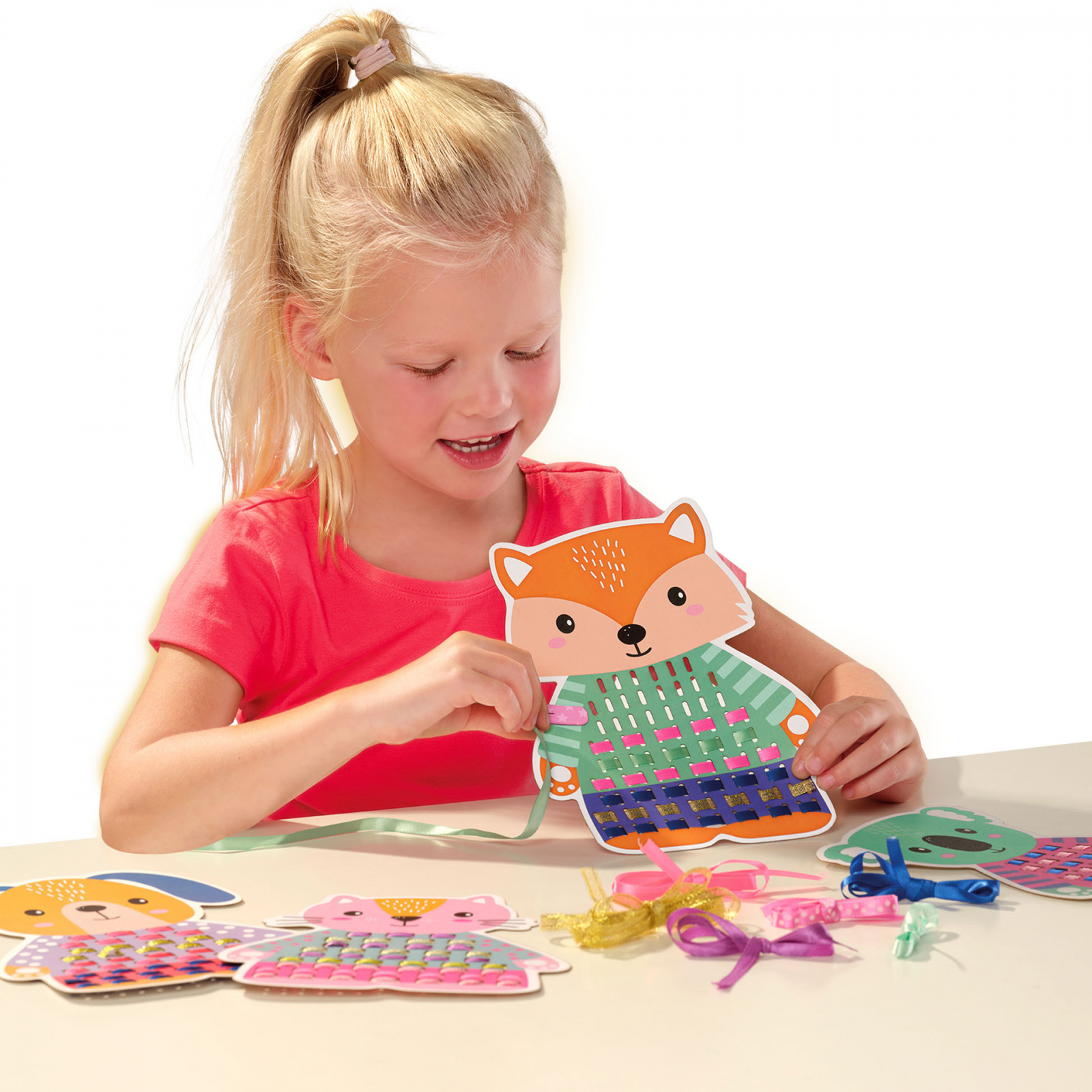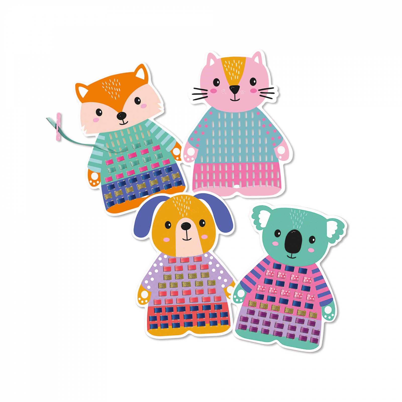 Cu aceste patru animale fericite, copiii se pot distra ore in sir. Utilizati cele cinci panglici furnizate pentru a completa tinutele animalelor. O provocare creativa care ii pune pe ganduri pe copii. Contine: 4 cartonase mari de animale pentru tesut cu ace de tesut din hartie; 6 culori de panglica; instructiuni. Dimensiuni: 30 x 20 x 4 cm.
