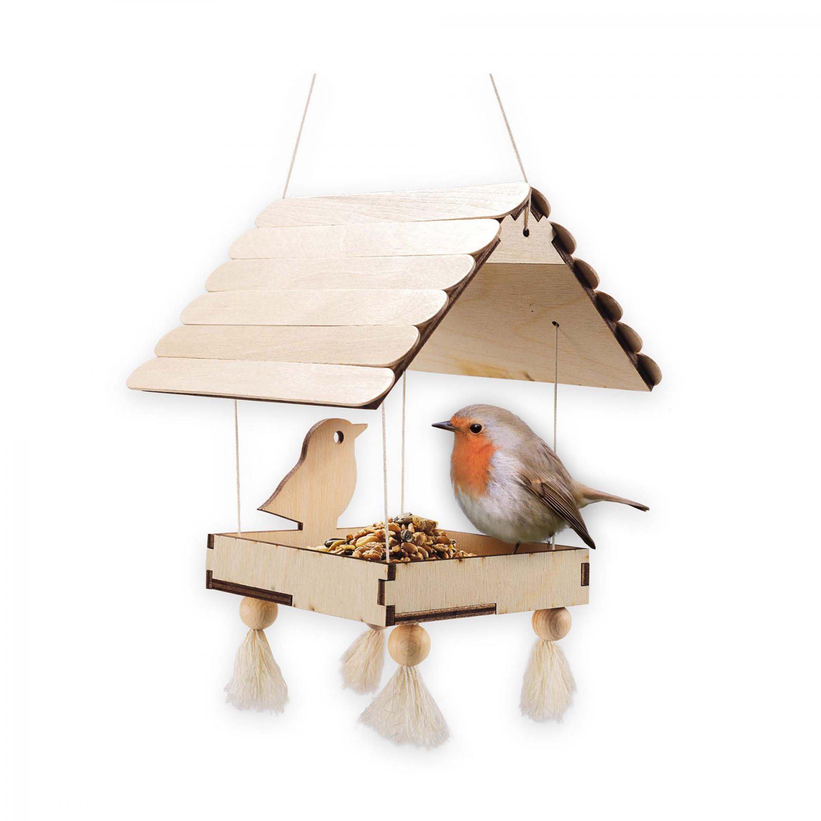 Acum va puteti construi propria casuta de hranire din lemn pentru pasari. Urmati pasii simpli pentru a asambla casuta de hranire. Agatati casuta afara, dar nu uitati sa adaugati putina hrana pentru pasari inainte de a face acest lucru. Contine: piese din lemn; fire de bumbac; margele de lemn; lipici si pensula. Dimensiuni: 30 x 20 x 4 cm.