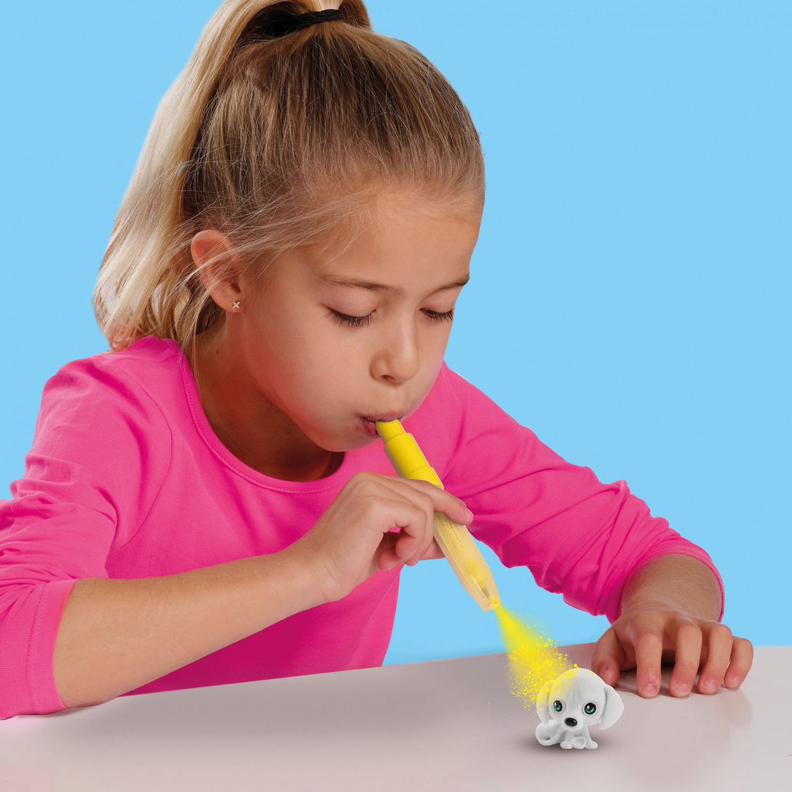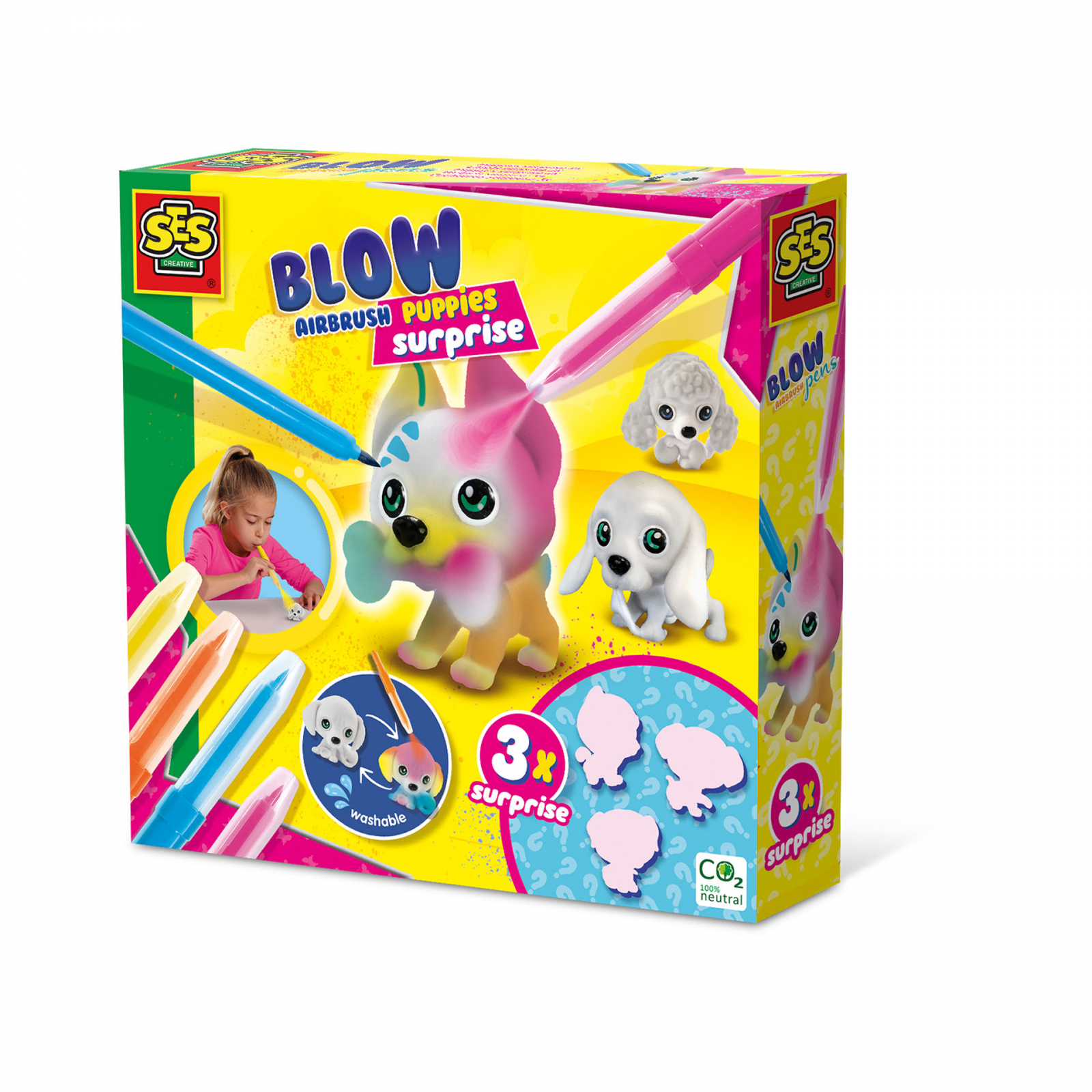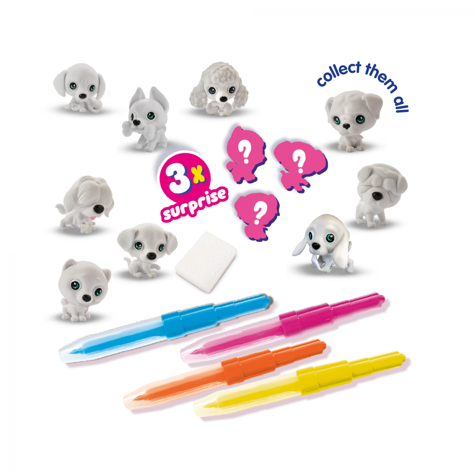 Set creativ copii - Desenez cu aerograf 3 catei surpriza.. Trei surprize asteapta sa fie gasite. Gasiti cateii, cu hainele lor albe moi. Cu cele patru markere aerograf colorate, puteti oferi fiecarui catelus culori vesele, puncte si dungi. Ati terminat? Spalati-le sub robinet si sunt gata pentru o noua creatie! Contine: 3 catelusi; marker galben cu aerograf; marker portocaliu cu aerograf; marker albastru cu aerograf; marker roz cu aerograf; burete. Dimensiuni: 20 x 20 x 4 cm.