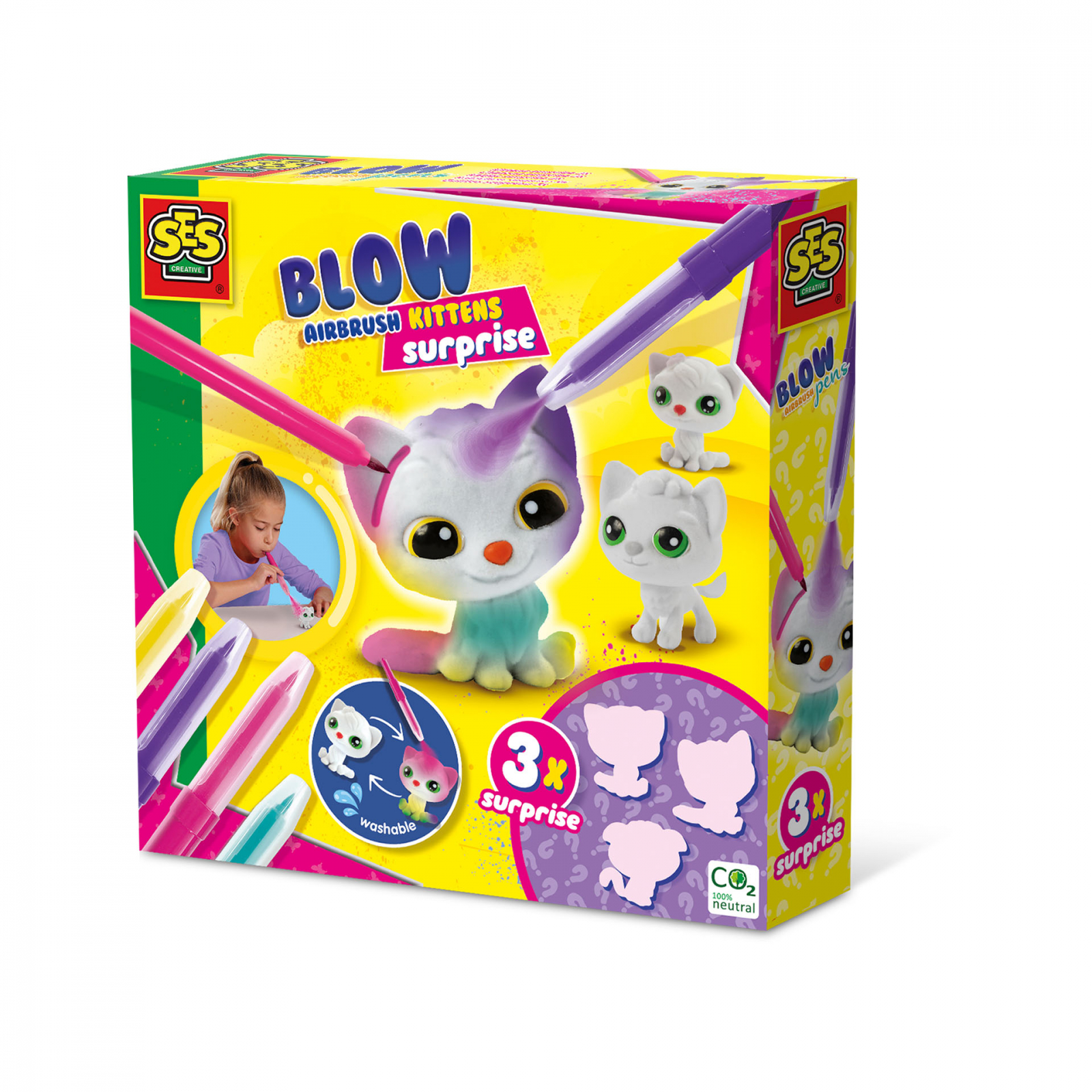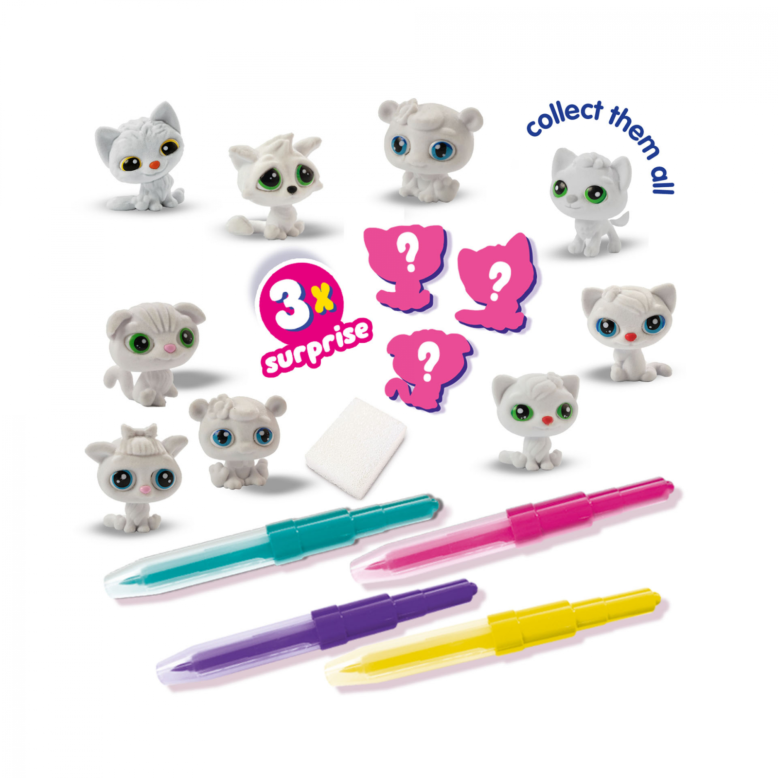 Set creativ copii - Desenez cu aerograf 3 pisici surpriza.. Trei surprize asteapta sa fie gasite. Gasiti pisoii, cu hainele lor albe moi. Cu cele patru pixuri colorate cu aerograf puteti oferi fiecarui catelus culori vesele, puncte si dungi. Ati terminat? Spalati-le sub robinet si sunt gata pentru o noua creatie! Contine: 3 pisoi; marker galben cu aerograf; marker violet cu aerograf; marker roz cu aerograf; marker turcoaz cu aerograf turcoaz; burete. Dimensiuni: 20 x 20 x 4 cm.