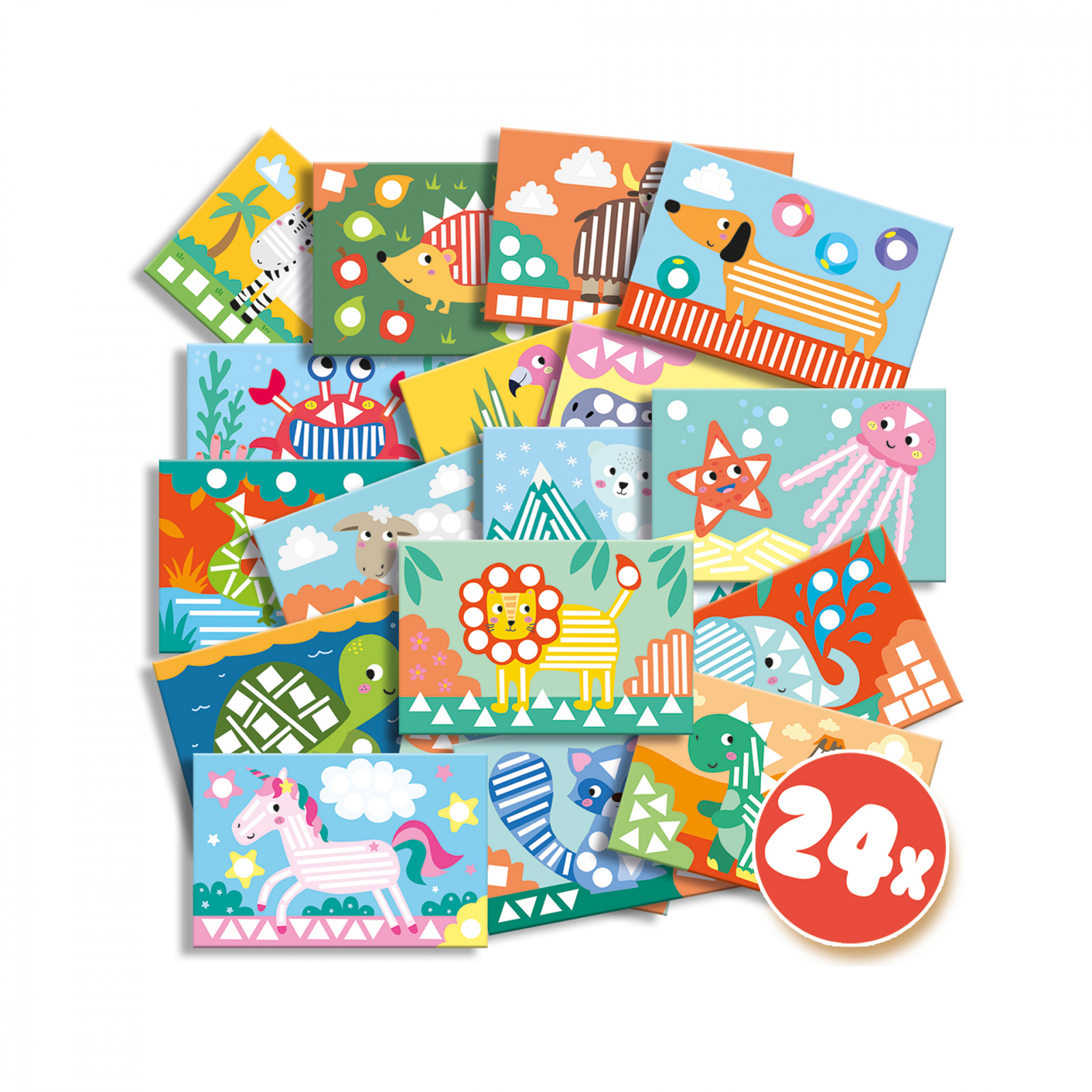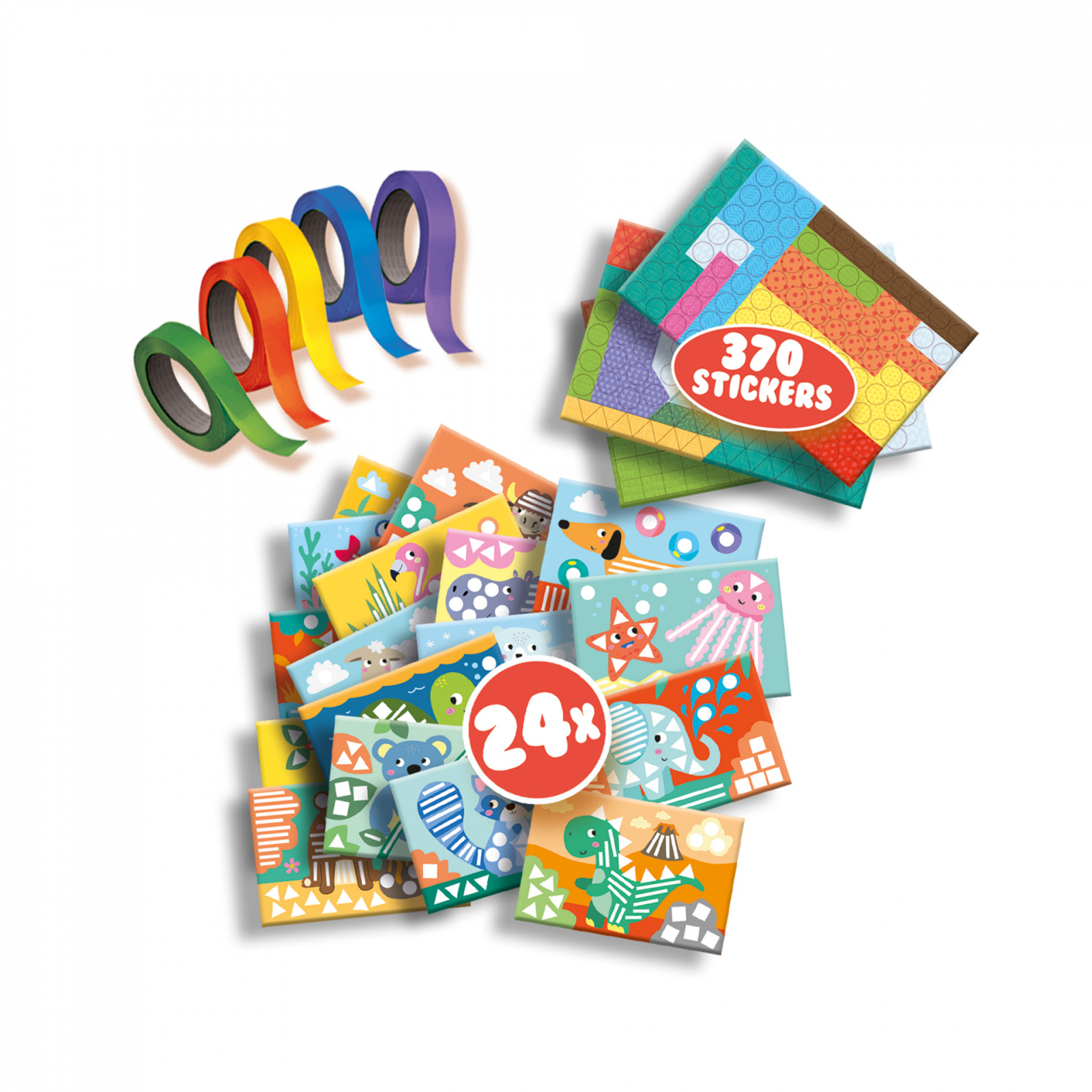 Set creativ copii - Invat sa lipesc si sa recunosc forme. - Sunt o multime de autocolante! Si atat de multe carti de animale! Acest set contine o cantitate imensa de autocolante si cinci role de banda, care trebuie sa fie lipite la locul potrivit. Puteti completa toate cele 24 de carti? Contine: 5 role de banda colorata; autocolante; 24 de carti de lucru. Dimensiuni: 30 x 20 x 4 cm.