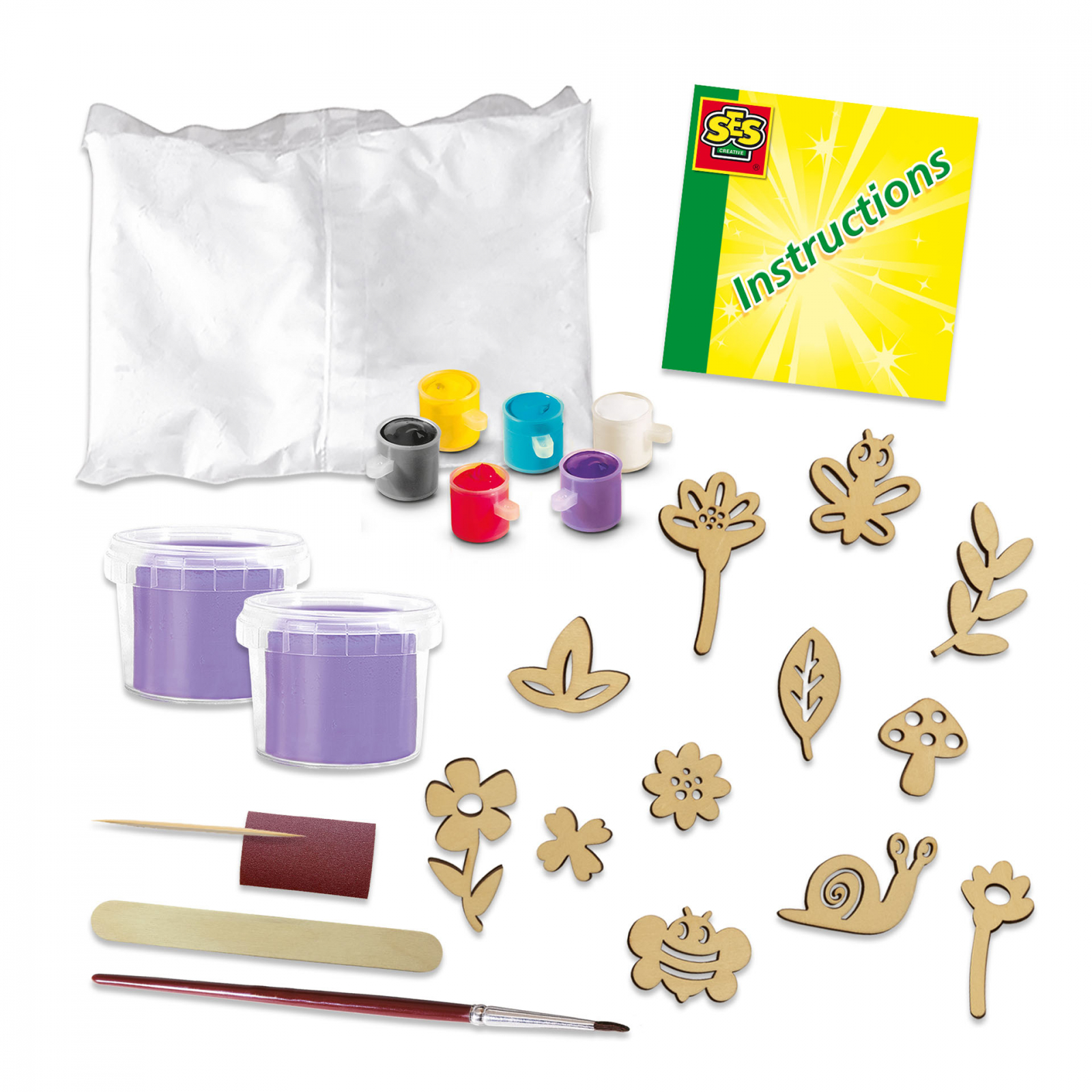 Set creativ copii - mulaj si pictura - Relief botanic inspirat din natură.. Faceti singur cele mai frumoase placi de ipsos! Determinati dimensiunea si forma cu argila si apasati in ea cele mai frumoase flori, animale si frunze din lemn. Turnati tencuiala in aceasta matrita de casa si faianta este gata de vopsit! Contine: forme din lemn natura; 2 vase cu plastilina liliac (2x90gr); ipsos; 6 culori de vopsea; pensula; spatula; bat de zgarieturi din lemn; smirghel; instructiuni. Dimensiuni: 30 x 20 x 6 cm.
