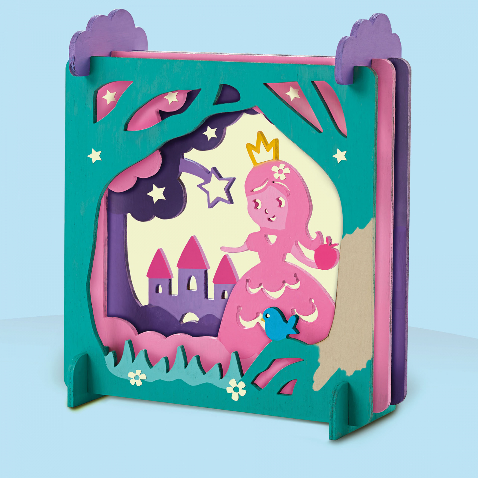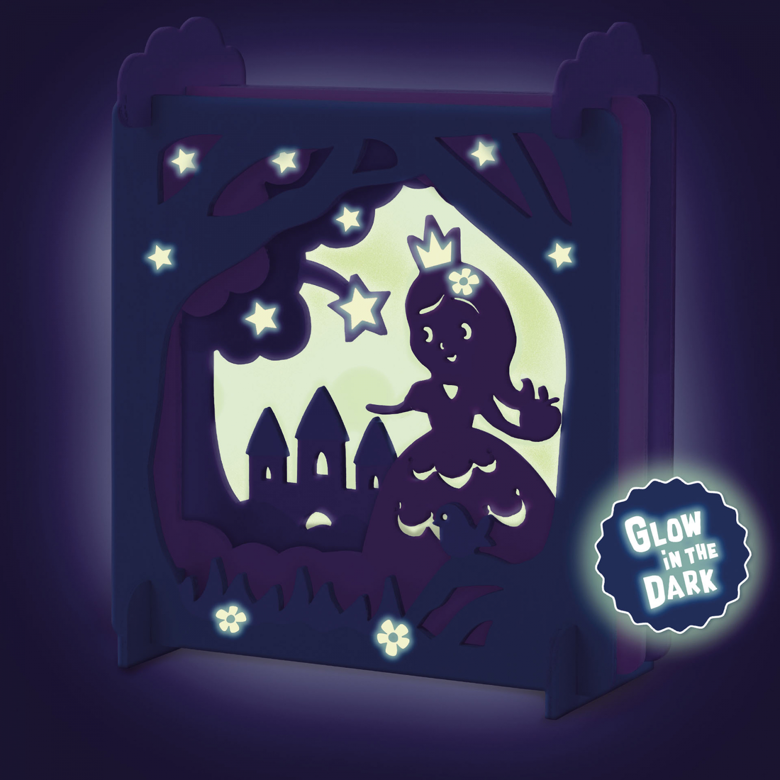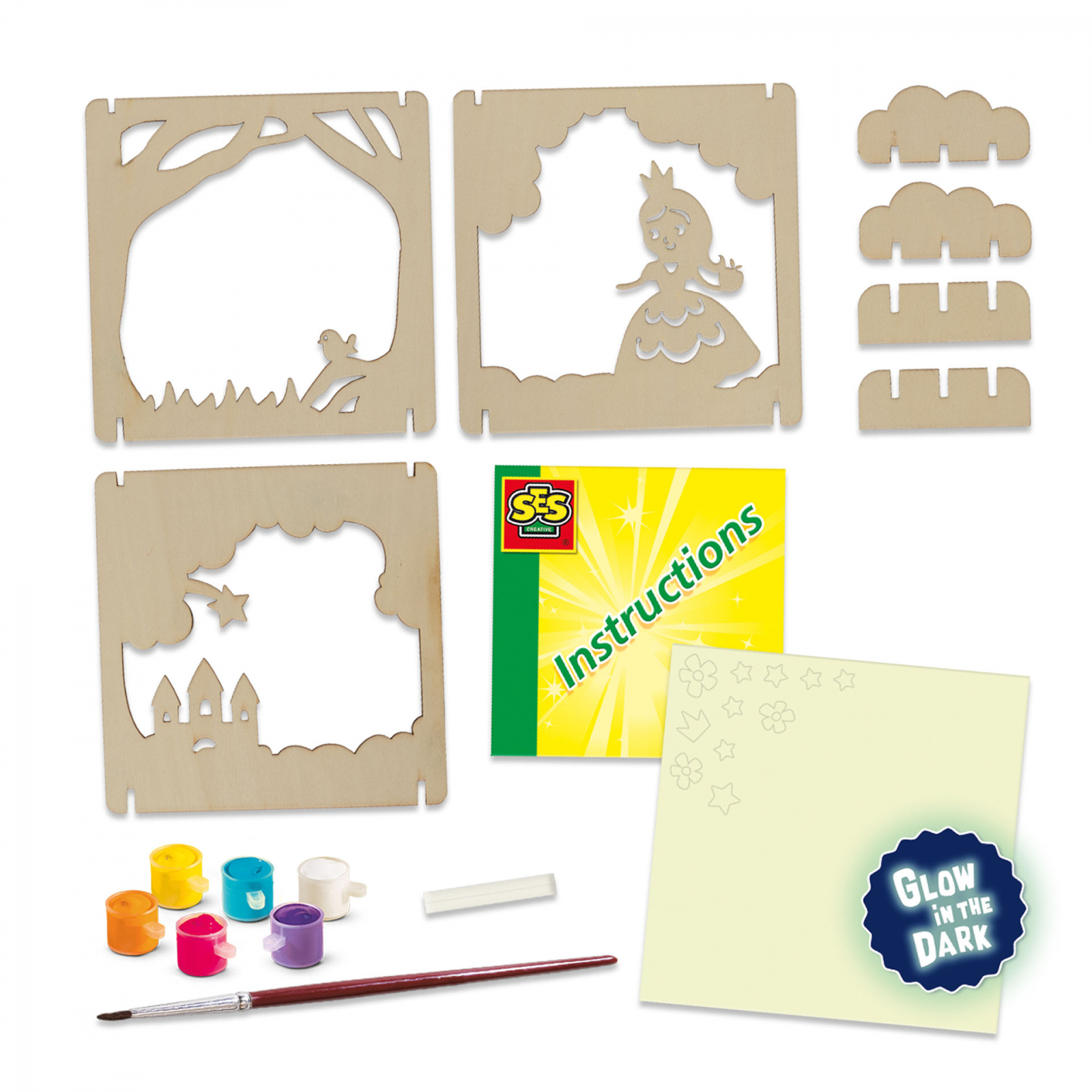 Set creativ copii - Povesti cu cutie de umbre, glow in the dark.. O cutie de umbra frumoasa pe care sa o faci si sa o decorezi. Aceasta cutie cu lumea printesei consta din diferite straturi care pot fi pictate in functie de propria ta creativitate. Prin lipirea autocolantelor glow in the dark pe si in spatele straturilor, obtineti o cutie unica de umbre stralucitoare, care este frumoasa in lumina si in intuneric. Contine: cutie umbra piese din lemn; foaie de autocolante stralucitoare in intuneric; 6 culori de vopsea; pensula; banda cu doua fete; instructiuni. Dimensiuni: 20 x 20 x 4 cm.