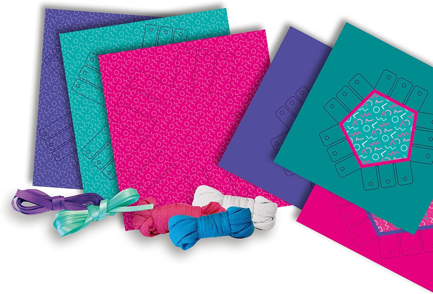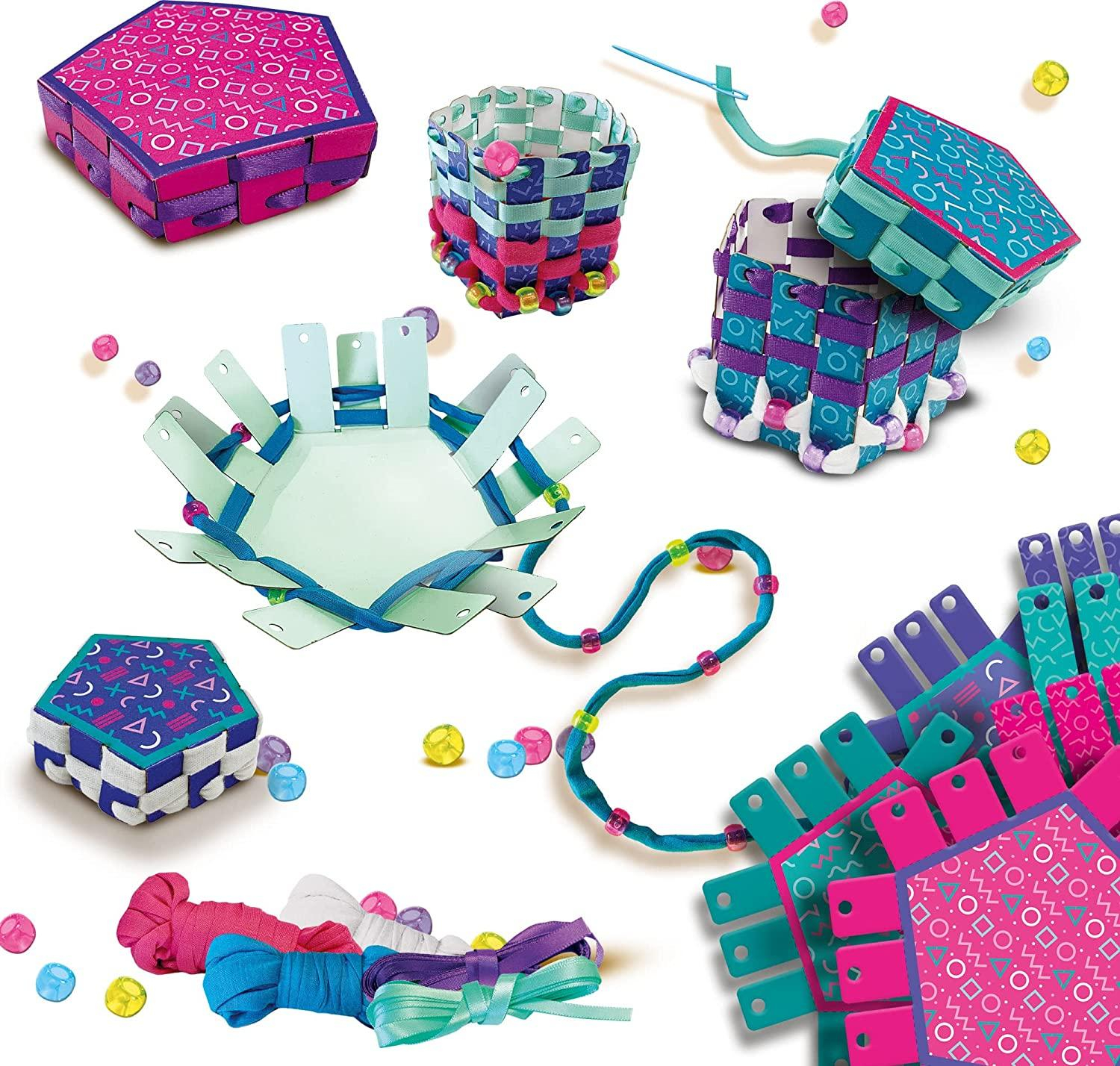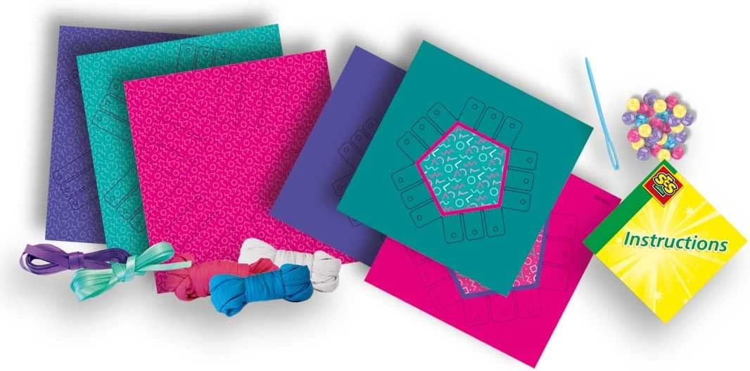 Invatati cu usurinta cum sa teseti cosuri cu acest set de tesut. Folositi cosurile de hartie ca baza si impletiti cele mai frumoase cosuri folosind acul de plastic sigur si firele de tricouri in trei culori. Lasati-va creativitatea sa scape si decorati cosurile cu margele de ponei si cele doua culori de panglica de satin. In set sunt suficiente materiale pentru trei cosuri cu capace. Contine: 6 piese de hartie pentru cosuri si capace; 3 culori de fire de tricou; 2 culori de panglica din satin; 4 culori de margele de ponei; ac de plastic, 3 culori de fire de tricou; 2 culori de panglică din satin; 4 culori de margele de ponei; ac de plastic.