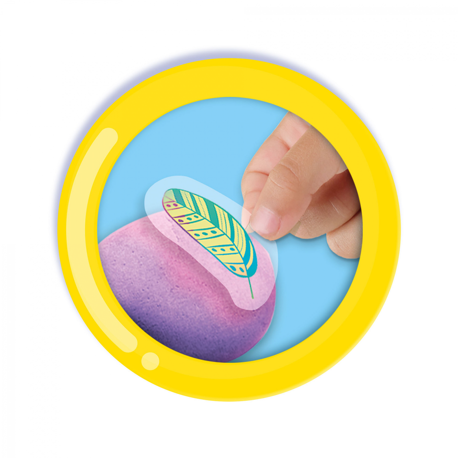 Cu putina creativitate, pietrele pot fi transformate in pietre frumoase de galaxie. Prin pictura si decorandu-le cu numeroasele autocolante, le poti transforma complet. Doar adaugati sclipiciul furnizat pentru atingerea finala. Contine: 5 pietre albe; foi de transfer; 6 culori de acuarela (6x5 ml); pensula; burete; adeziv cu sclipici argintiu (5 ml); instructiuni; Dimensiuni: 15 x 20 x 4 cm.
