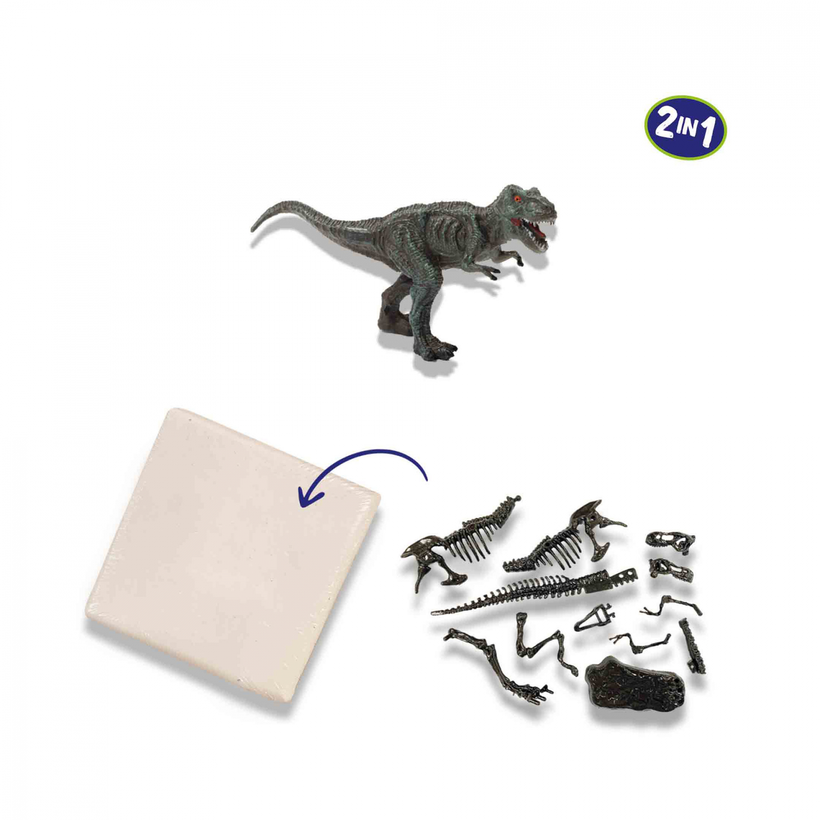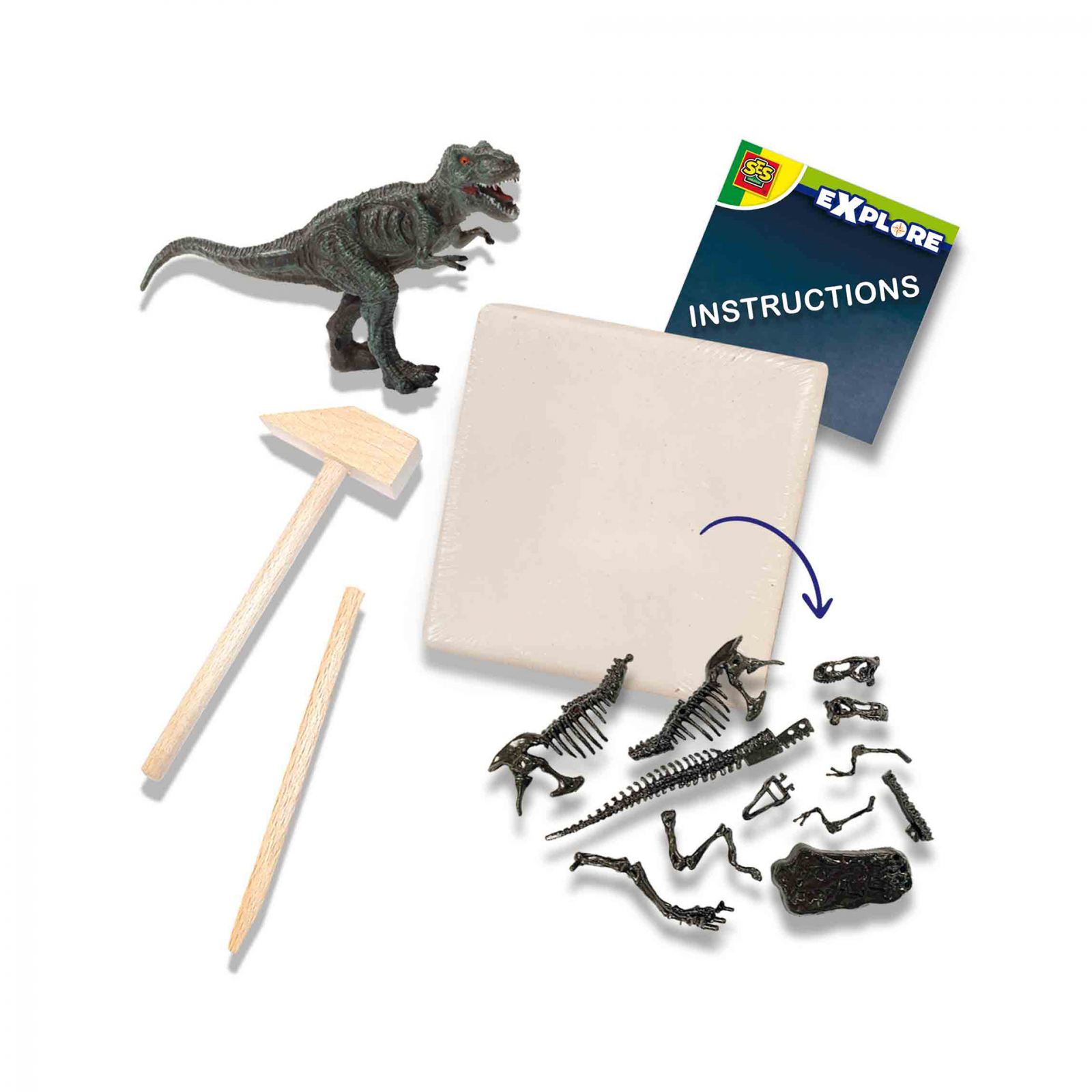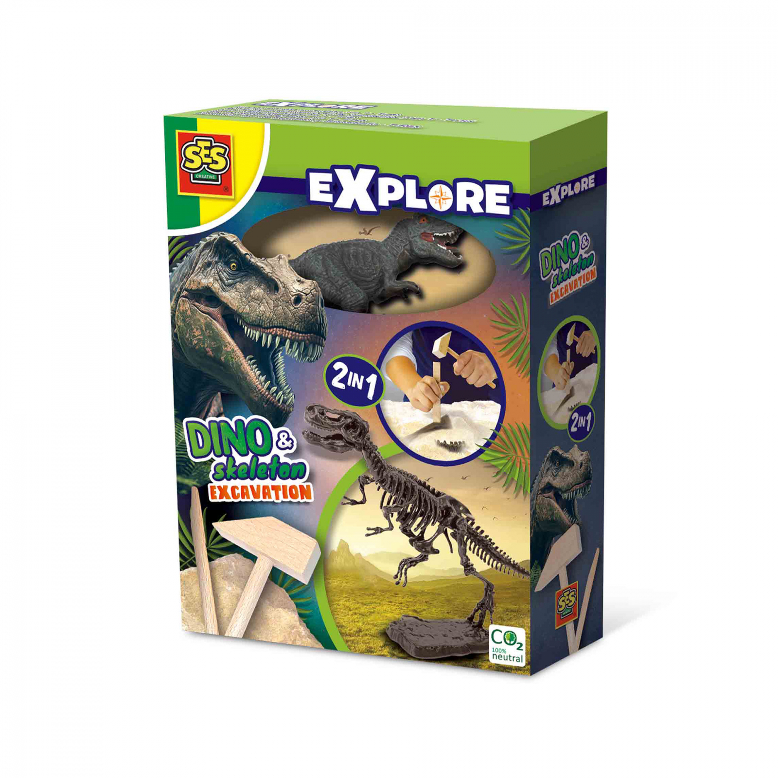 Copiii il pot descoperi pe arheologul din ei insisi cu acest set de sapaturi 2 in 1. Setul este format dintr-un bloc de aschii cu schelet T-rex, figura de joc T-rex, un ciocan din lemn, dalta si instructiuni. Copiii pot incepe sa dezgroape partile unui schelet de dinozaur adevarat si sa le adune ei insisi dupa dezgropare. Se pot juca ore intregi cu figurina mare T-rex. Contine: figurina de joc T-rex; bloc de sculptat cu schelet T-rex; ciocan din lemn; dalta de lemn; instructiuni. Dimensiuni: 15 x 20 x 5 cm.