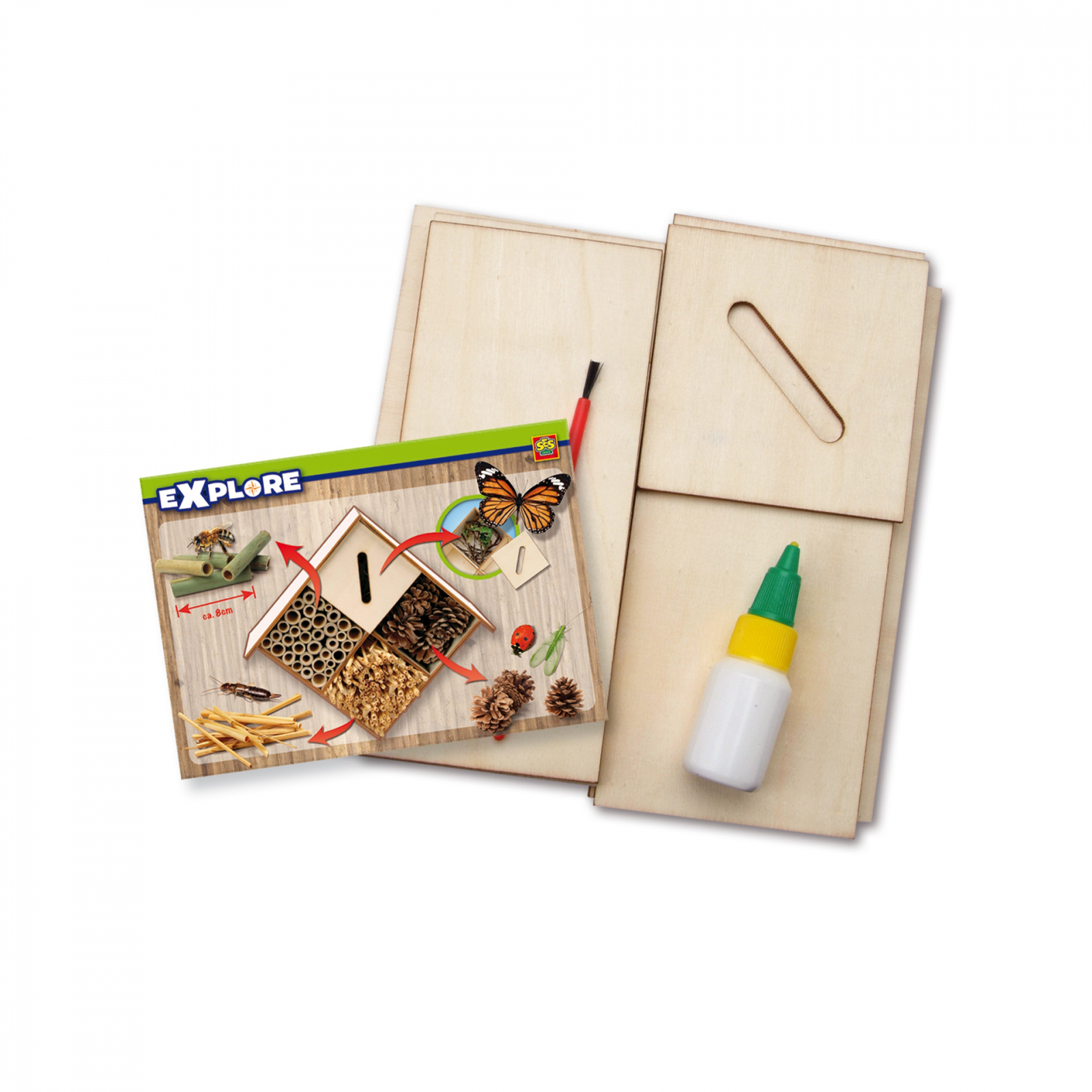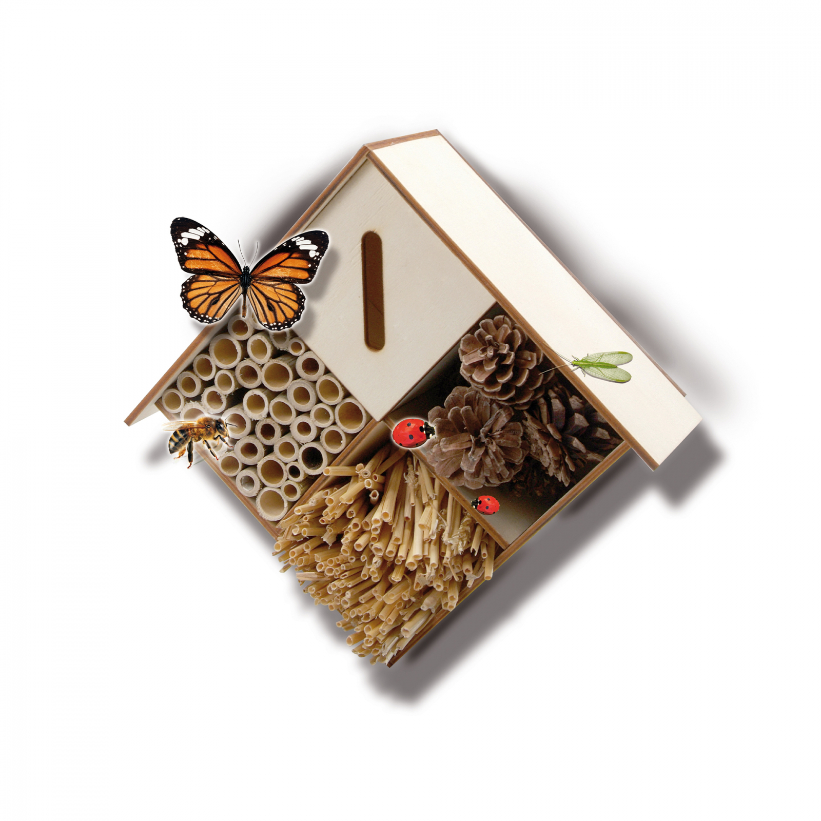 Faceti un hotel fantastic de insecte pentru gradina. Asamblati hotelul din lemn si umpleti camerele cu diferite materiale pentru a atrage diferite tipuri de insecte. Observati cum locuiesc acestea in hotel. Fluturi, albine, buburuze, gandaci si multe altele. Contine: Kit din lemn pentru hotelul de insecte; lipici; fisa de informatii. Dimensiuni: 30 x 20 x 4 cm.