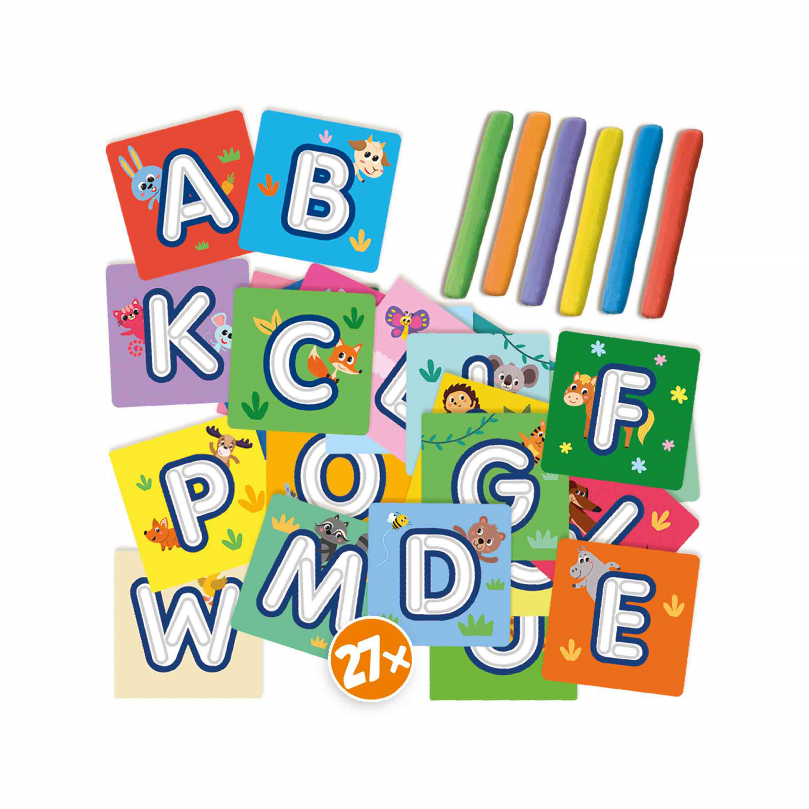 Fiind activi cu literele, copiii invata alfabetul intr-un mod jucaus! Fiecare litera este infatisata pe un cartonas separat, iar prin rostogolirea serpilor, bilelor si snururilor din cele 6 culori de plastilina, copiii pot modela literele una cate una. Cu diferite carduri asezate in ordine, ele formeaza chiar cuvinte scurte sau nume. Contine: 27 de carti cu alfabet; plastilina in 6 culori (6 x 20 gr). Dimensiuni: 20 x 20 x 4 cm.