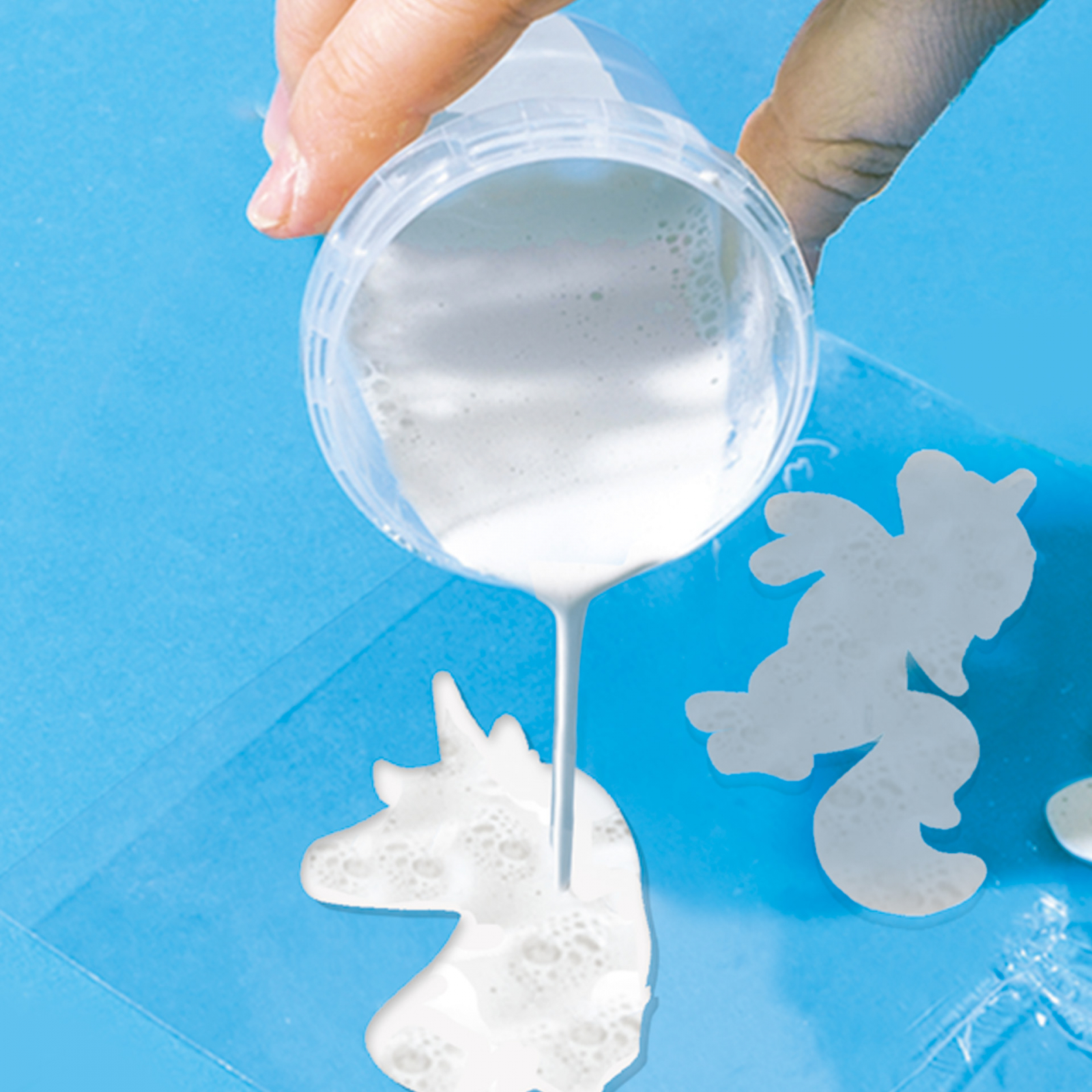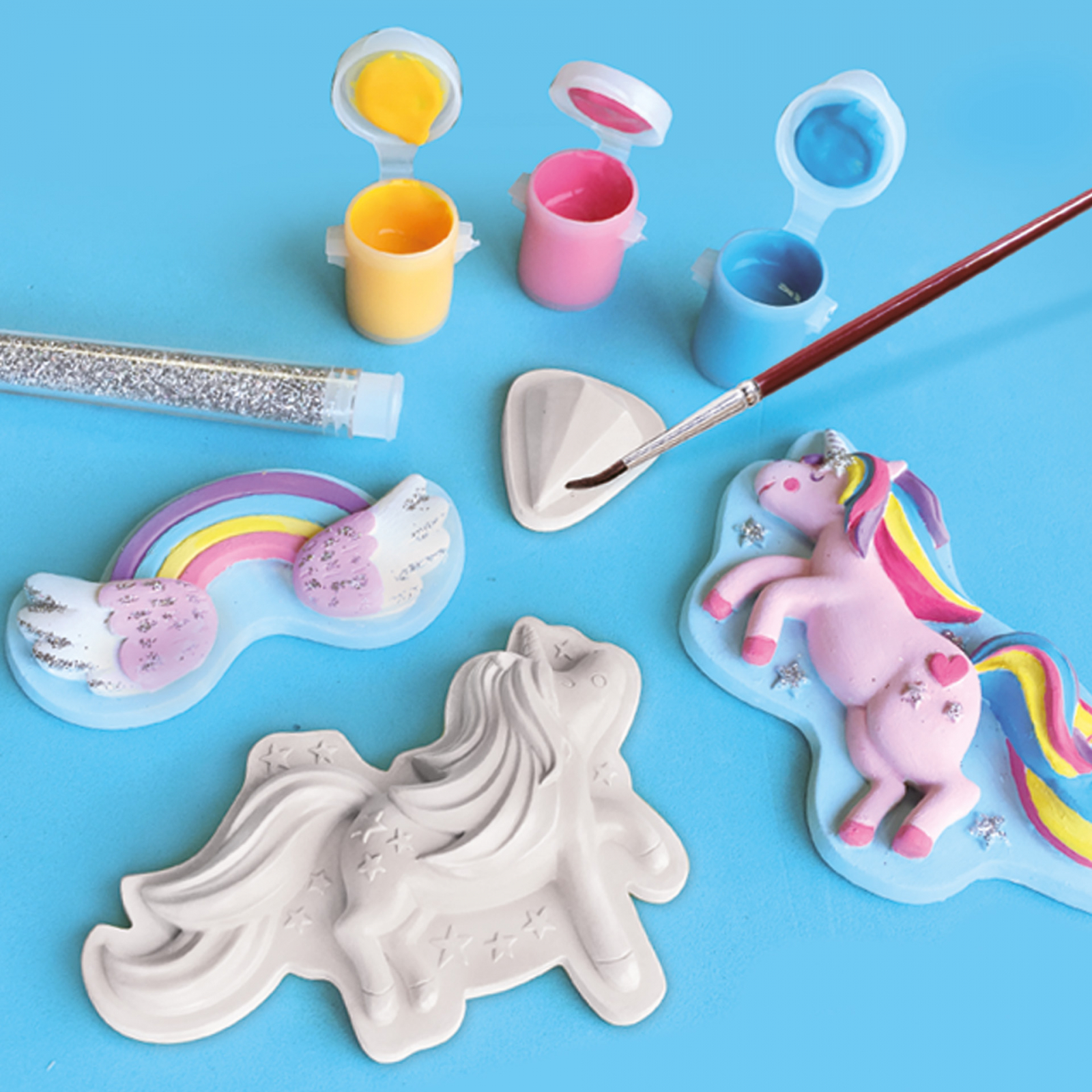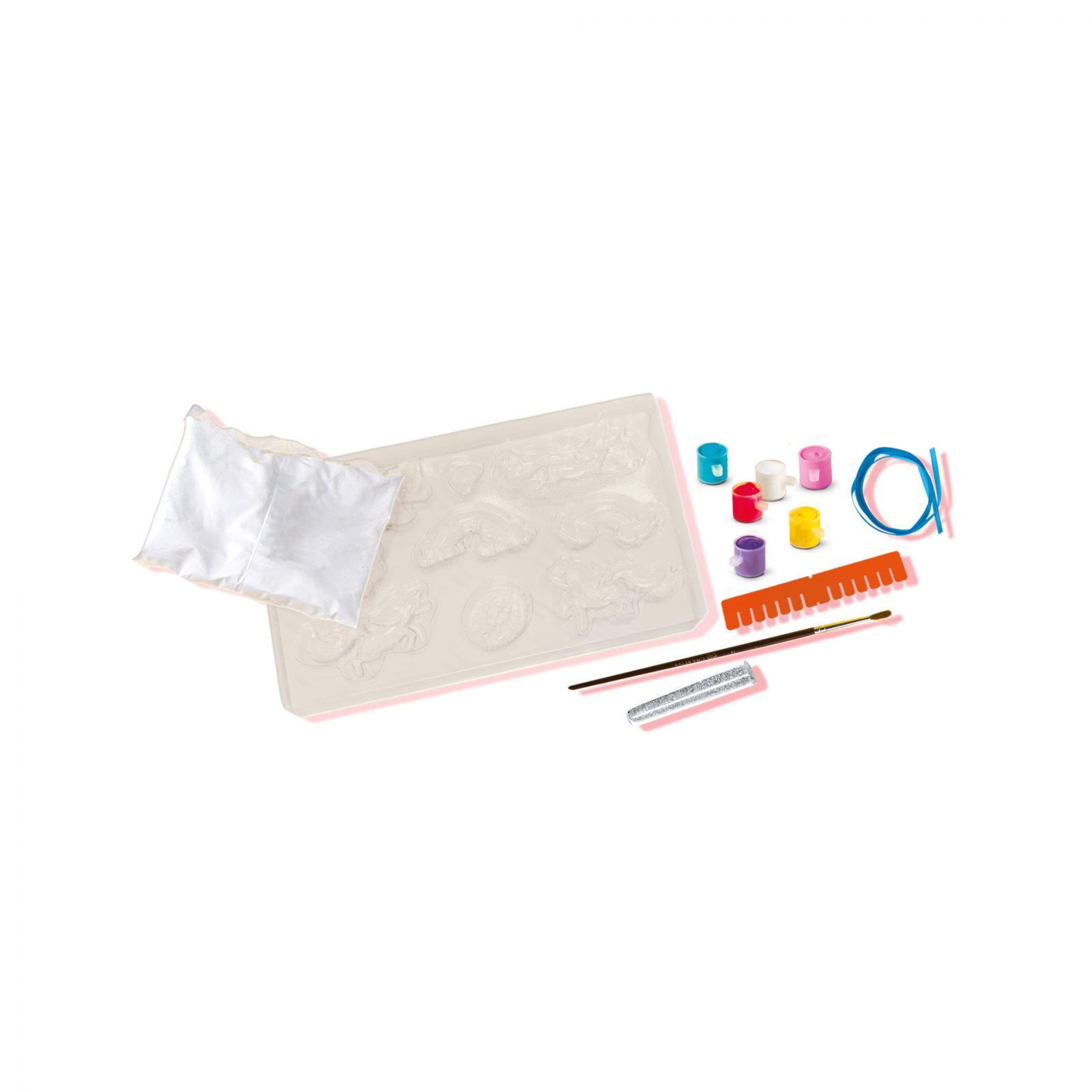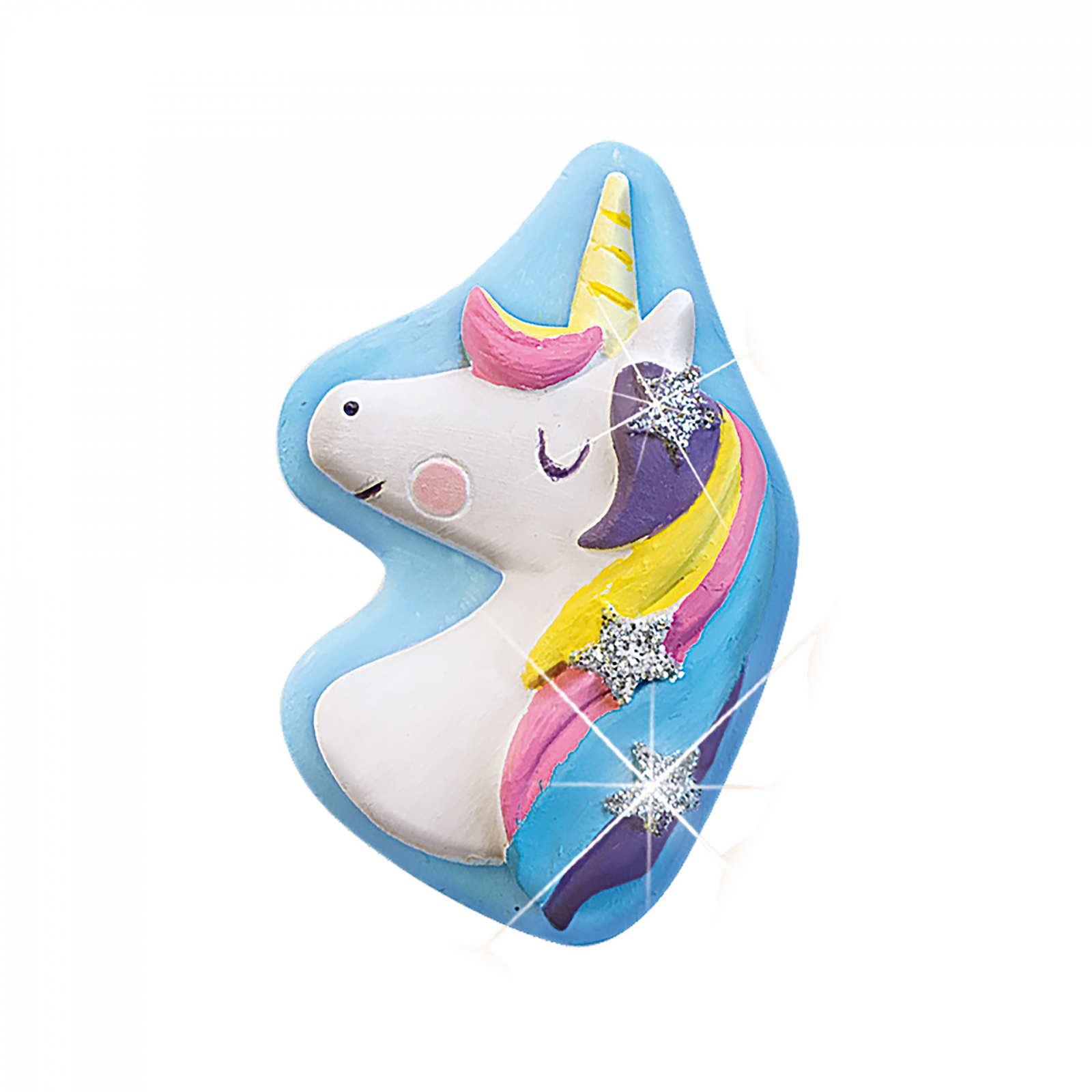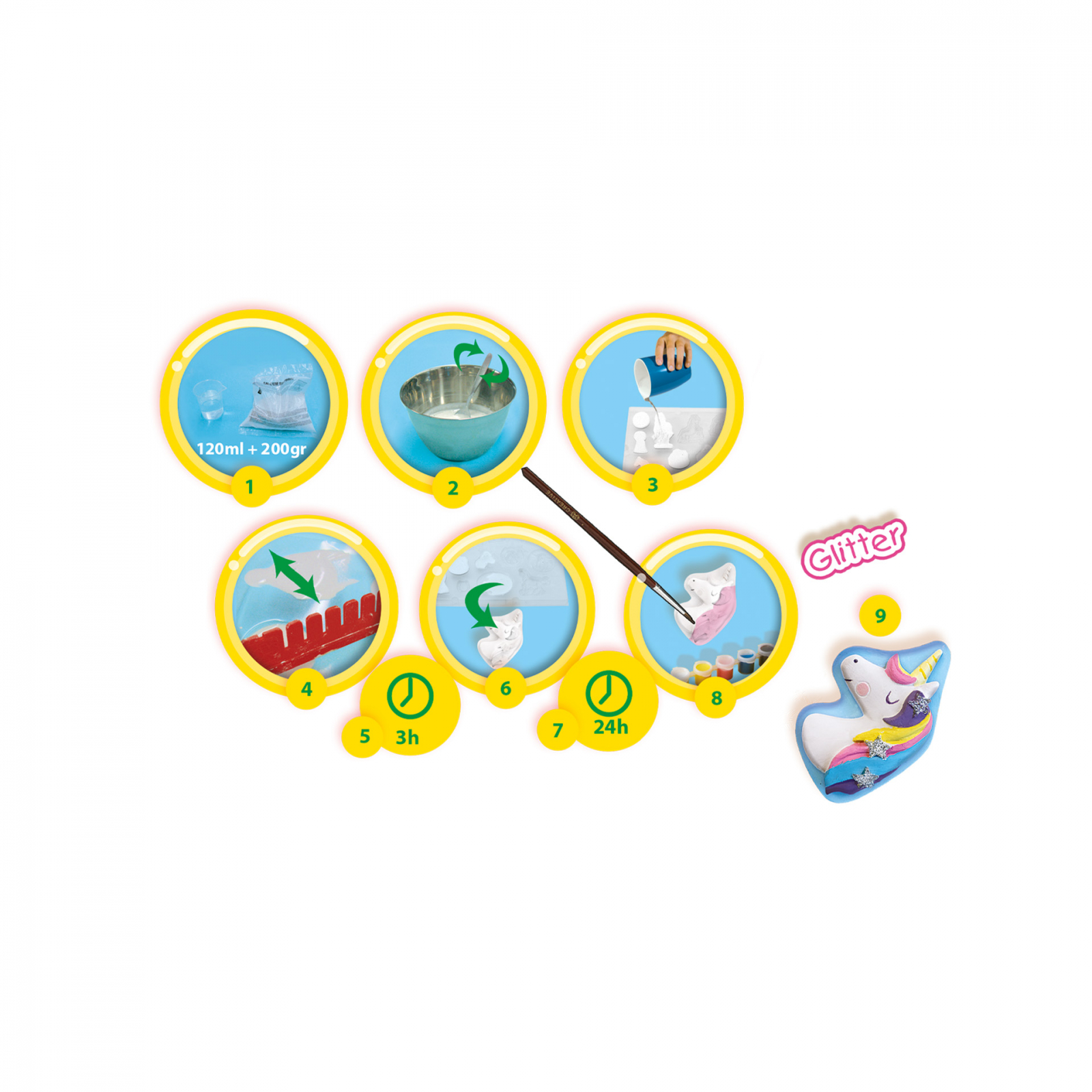 Acest set va permite sa sculptati tot felul de figurine de unicorni, din ipsos. Turnati amestecul in matrita si lasati sa se intareasca. Luati acuarela furnizata si pictati cele douasprezece figurine dupa cum doriti. Contine: ipsos; matrite; 6 culori de acuarele la moda; pensula; instrument de netezire; tub cu sclipici argintiu; panglica albastra din satin. Dimensiuni: 30 x 20 x 4 cm.