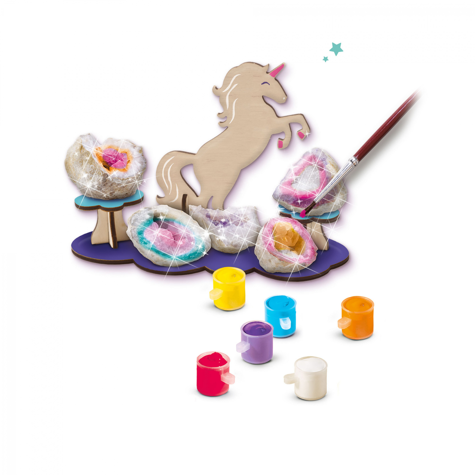 Set de pictat geode pentru copii cu suport unicorn.. Acest set nu numai ca face posibila descoperirea geodelor, ci si afisarea acestora. Dupa ce le-ati deschis, le puteti decora cu vopsea si le puteti aseza pe display-ul unicorn din lemn. Display-ul poate fi, de asemenea, decorat si pictat.