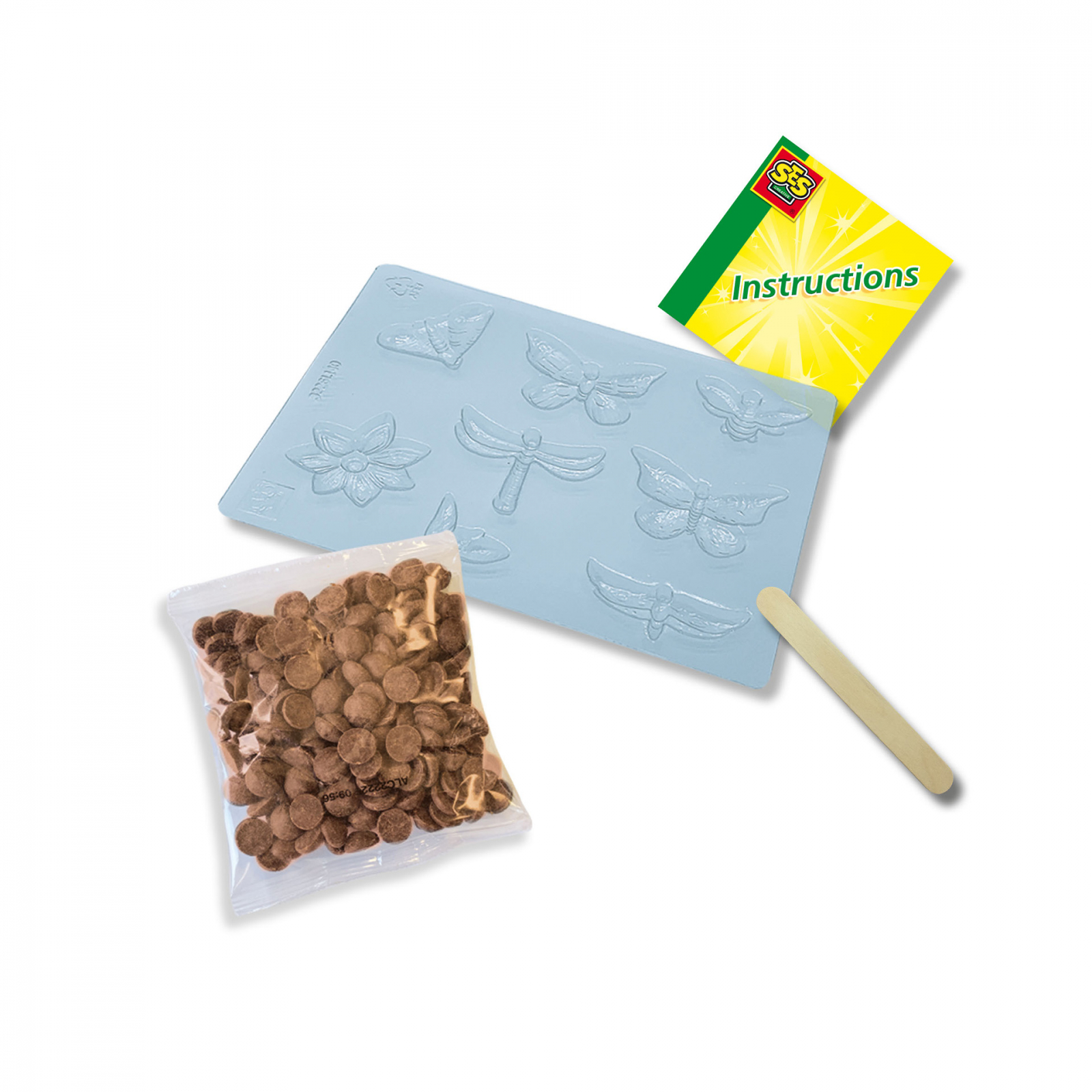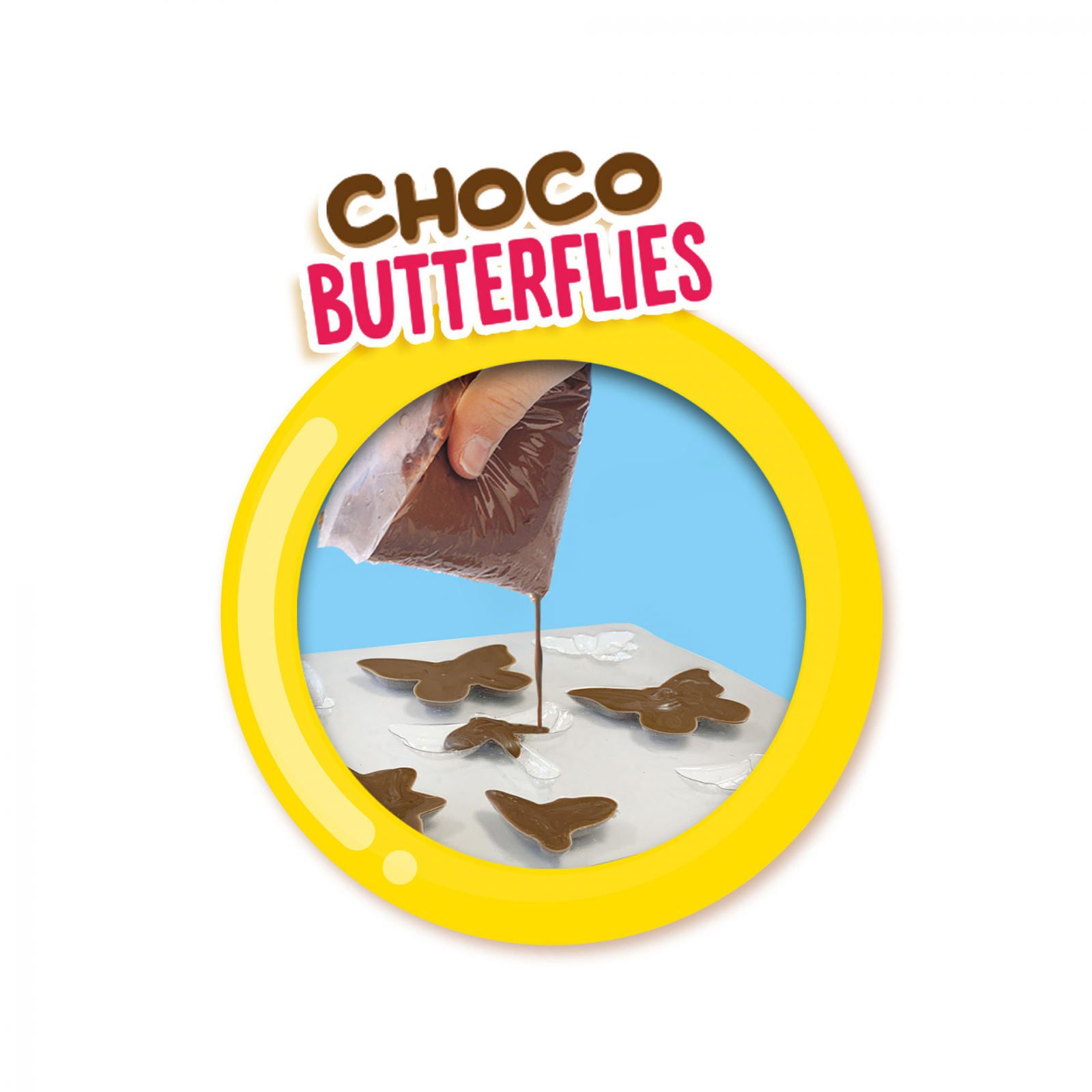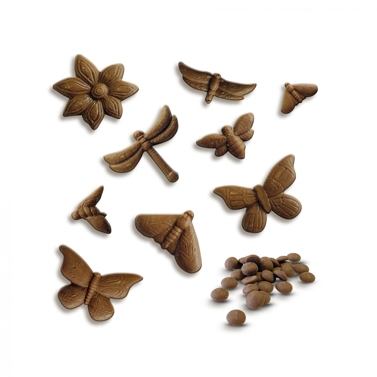 Contine: perle de ciocolata cu lapte (100g); matrita pentru fluturi; spatula; instructiuni.