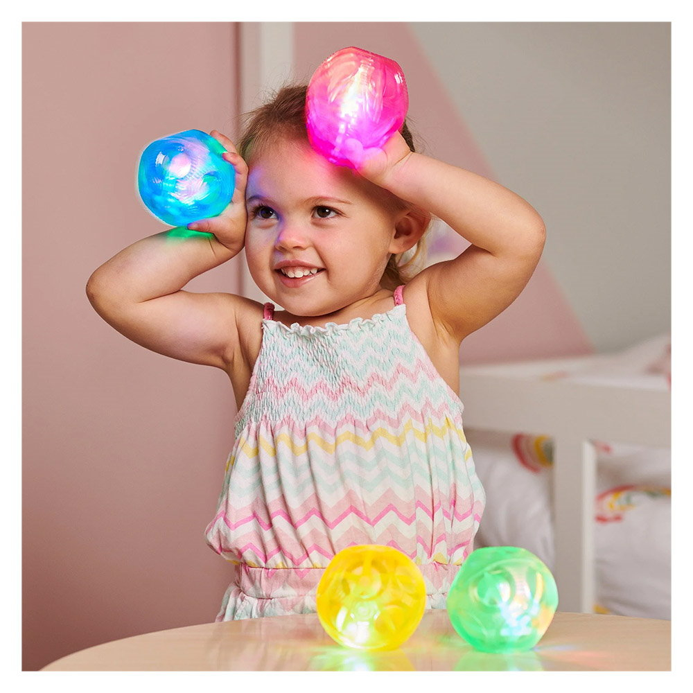 - Atunci cand sunt atuncate si lovite, mingile se aprind si clipesc, facandu-le grozave pentru jocurile senzoriale sau pentru jocurile de aruncare si prindere.